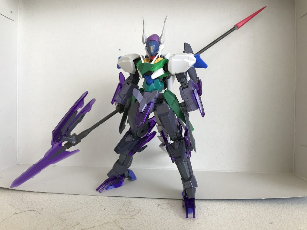 ダークネイビーにシルバー、パープルのクリアーパーツが少しダークのたたずまい出していてカッコいい!武装好きの私としては、黒竜槍に見惚れてます。