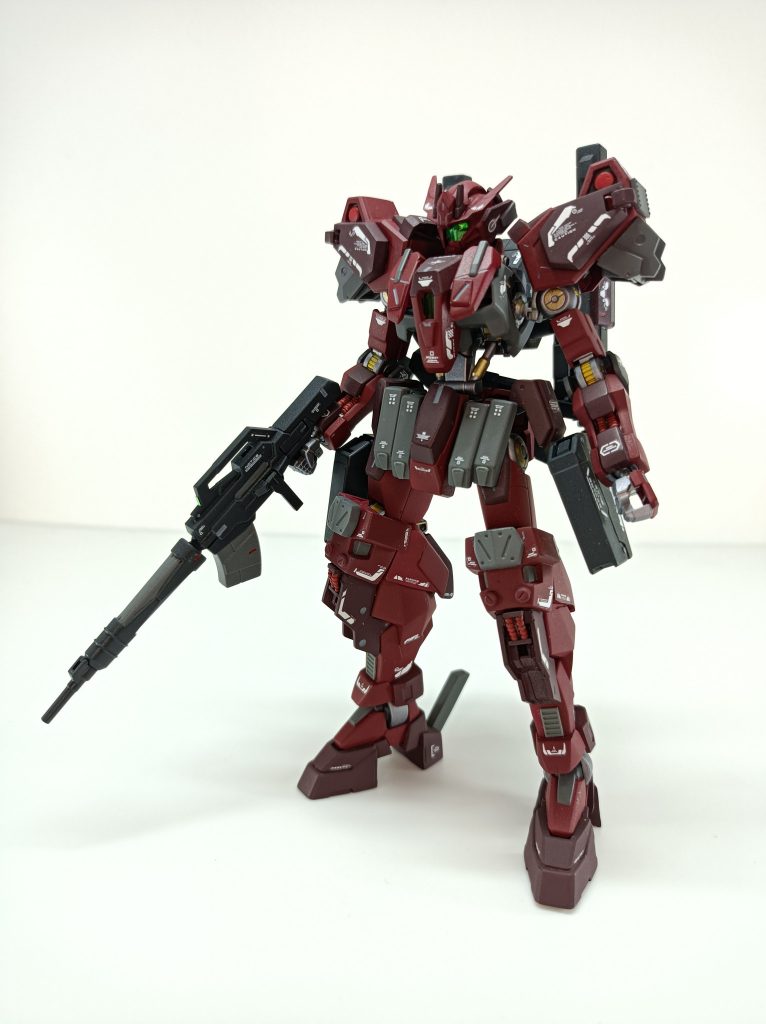鉄血系の素体にケルディム、アストレアのパーツがスマートに組みこまれていて鉄血系にいそうな00機体という絶妙なバランスに仕上がっているのがほんと素晴らしいですわ☺️✨