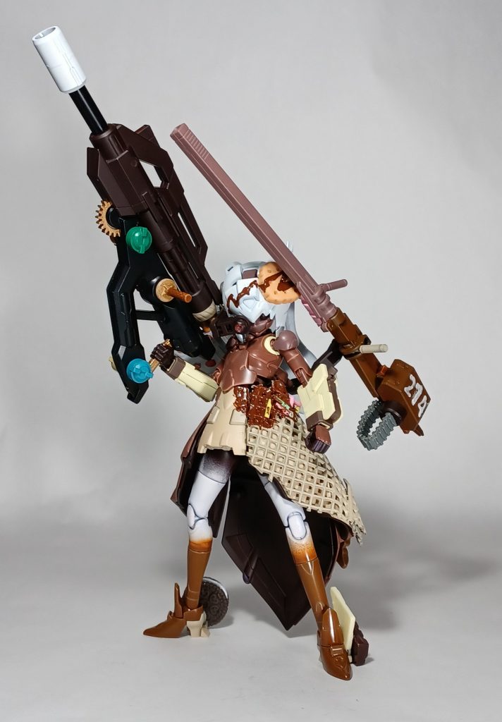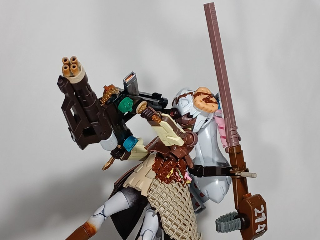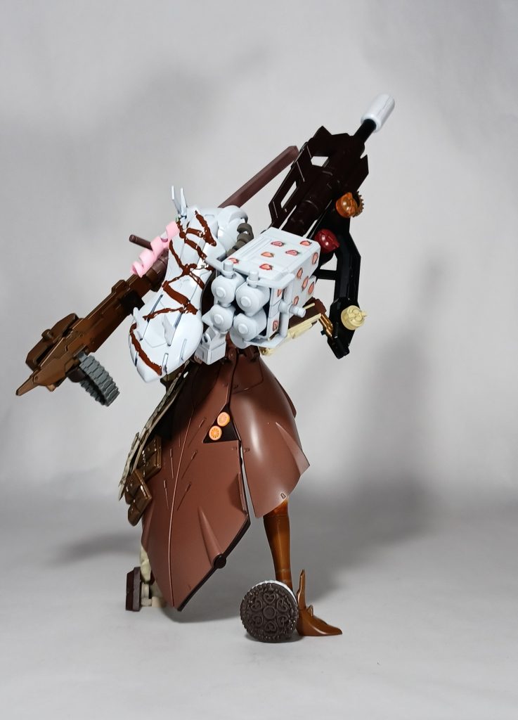 ミサイルランチャーはア○ロチョコレートを、スピニングブラスターはポ○キーとマー○ルチョコを、レールガンはル○ンドを塗装の配色に落とし込んでます。