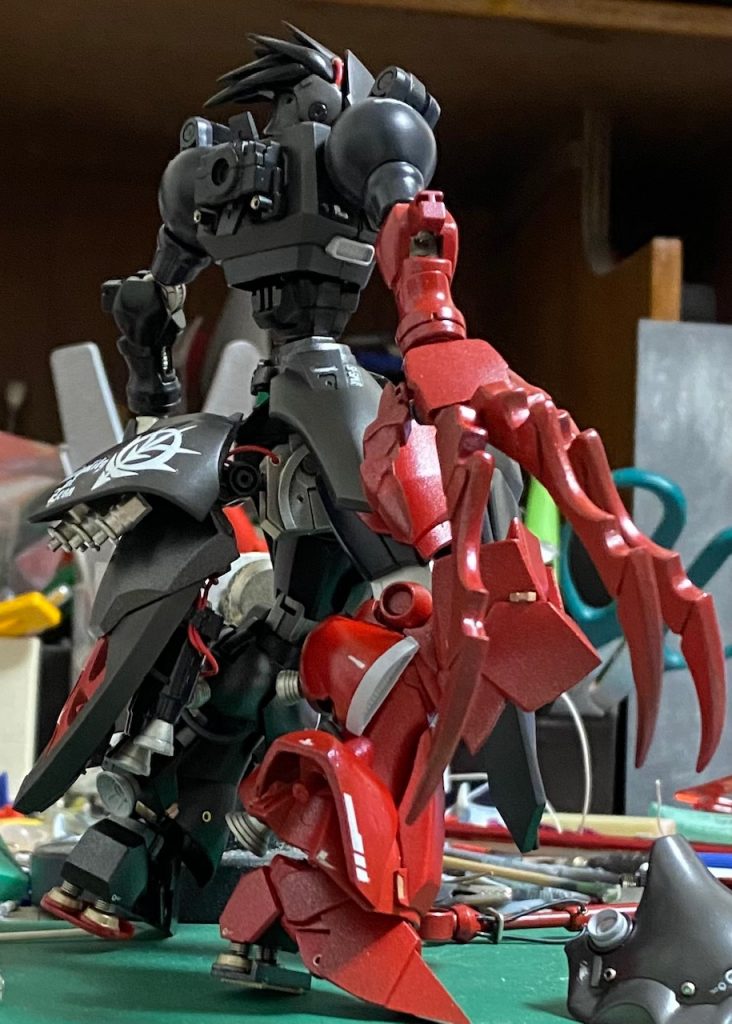 YMS-15DL Gyan Dest-Lion(ギャン デストリオン)を作成しました。ギャンスロットをベース機体としています。自分の最も好きなMSであるギャンをベースにジオンからネオジオン・袖付きへと連なるDNAを継承させた機体をイメージして、各年代のジオン系機体をミキシングしています。ギャン系機体であり、騎士然としたギャンスロットをベース機体にしていますが、バトルイメージはまさに蛮勇であり、自分の好きな近接戦闘を主眼においた戦い方ができるよう調整をかけた機体になります。