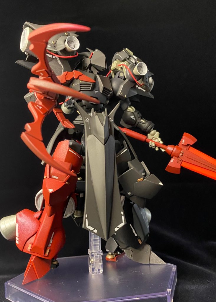 当初はメタリック塗装にしようと思い始めましたが、結局は艶消し仕上げに。黒赤の機体ですが、単調にならないようパーツごとに色目を変えてみました。