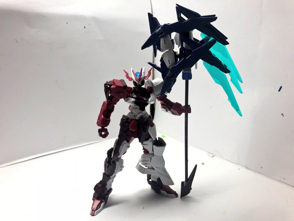 また、今回AGE2マグナムのFファンネルを使用したのですが、そのままではあまりにもポン付けすぎるので、そちらにも羽パーツを切り貼りして装飾を施しました。左右非対称のイメージを崩さないよう統一感のない装飾を考えるのが大変でした。