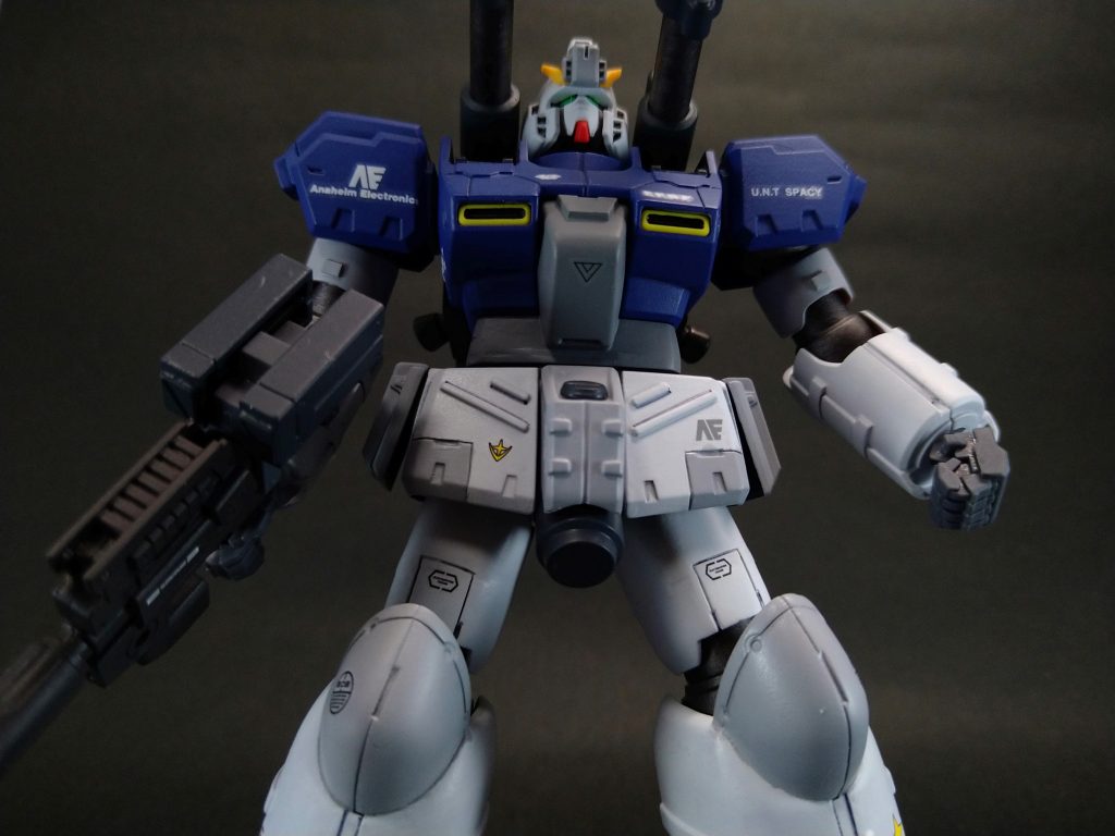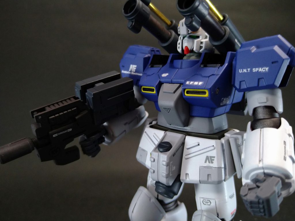 作品は量産型ガンキャノンをベースにディテールパーツを追加。ガンダムフェイスは、"HGUCガンダムヘイズル改"から。ブレードアンテナはそのままだと両肩のキャノンに干渉するため、短く整えました。