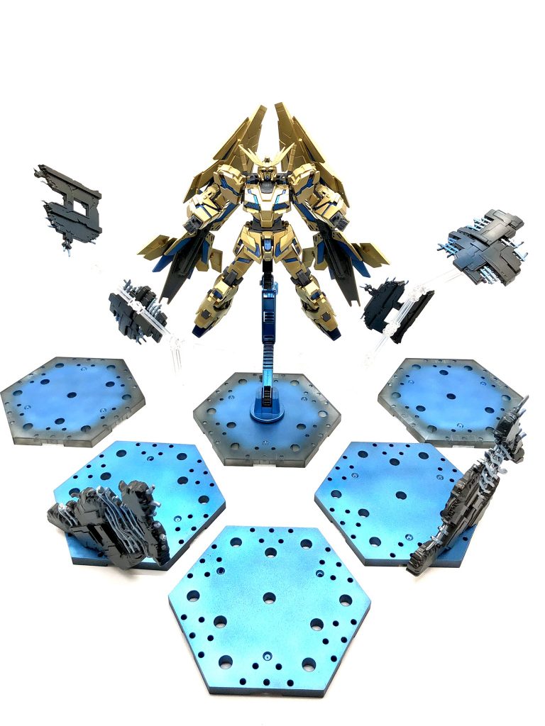 余剰のアクションベースに設置して展示します。サイコパワーで押し出されるような演出を飾る時にできるよう上からメタリックブルーを吹いてます。