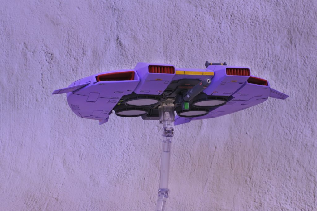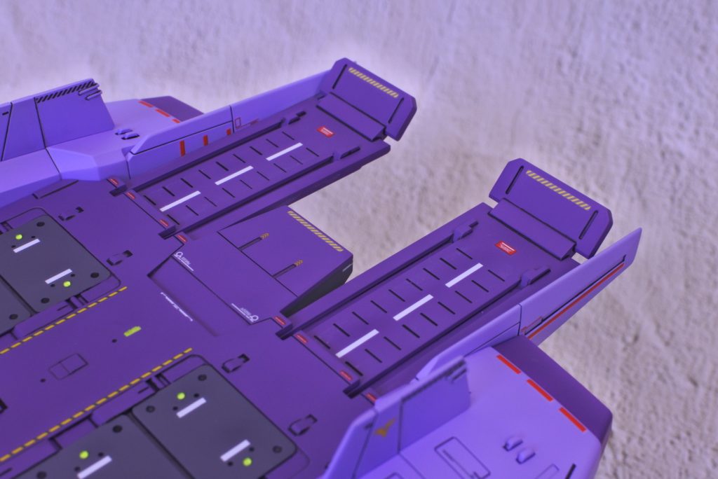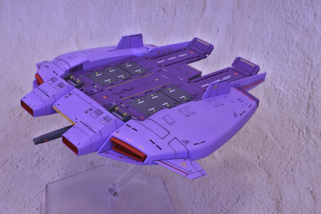 ![[本体]・機体側面パーツ、機首下部メガ粒子砲の合わせ目消し。・機首下面の肉抜き穴と、機体後部下面の使用しない接続穴をクレオス瞬間接着パテで埋めて処理。・メガ粒子砲の砲口にHI-Qパーツのツインパイプ2シルバー2.5mmを使用し、ディテールアップ。・Hアイズのランナーから削り出した自作クリアパーツを使用し、以下の箇所をディテールアップ。→コクピットキャノピー(蛍光イエロー裏打ち)→メガ粒子砲センサー(蛍光グリーン裏打ち)→機体上面、下面の航空灯(蛍光グリーン、レッド裏打ち)・機体上面に、蛍光イエローで裏打ちしたHアイズ3クリアの1mmを使用し、MS積載デッキの誘導灯をイメージしてディテールアップ。・機体下面に、蛍光イエローで裏打ちしたHアイズ3クリアの2.5mmを使用し、着陸灯をイメージしてディテールアップ。・エアインテークの内部にwaveモールドプレート1をカットして使用し、ディテールアップ。[カラー]・本体ライトパープル、ダークパープル クレオスパープルをベースに調色・本体レッド クレオスシャインレッド・本体グレー クレオスグレーバイオレット・メガ粒子砲グレー クレオスニュートラルグレー、ガンダムカラーMSグレージオン系で塗り分け・ランディングギアグレー ガイアメカサフヘヴィ・ランディングギアシリンダー、スラスター、エアインテーク内部 ガイアスターブライトシルバー ※下地にクレオスブラックを使用・墨入れ タミヤスミ入れ塗料ブラック タミヤエナメルフラットブラック・本体トップコート クレオススーパースムースクリアつや消し・サーフェイサー クレオスフィニシングサーフェイサー1500グレー[デカール]・アクセント程度に汎用デカール(ガンダムカラーデカール、ベルテクス等)を貼付け](https://gumpla.jp/wp-content/uploads/2022/03/C298F38D-F9FB-4FE0-8547-F071F52B82A2-1024x684.jpeg)