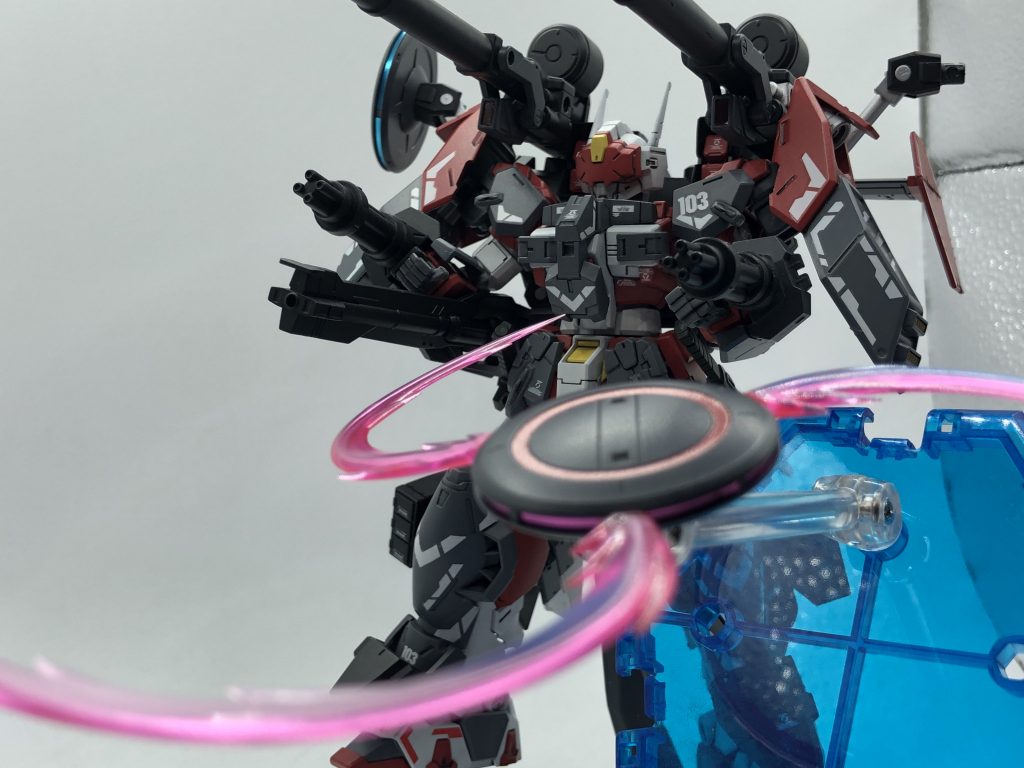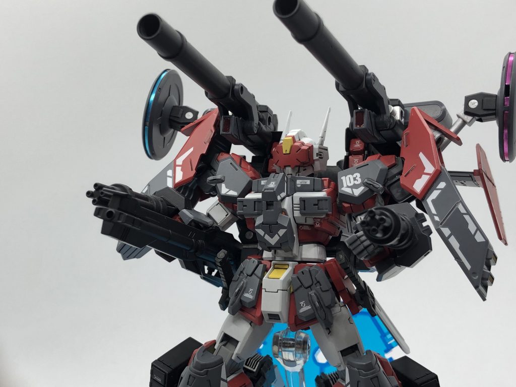 ノーマル版との違いはバックパックに大型キャノン&飛行ユニット、肩にシールドブースター、脚部スラスター 増加、脚部大型化。