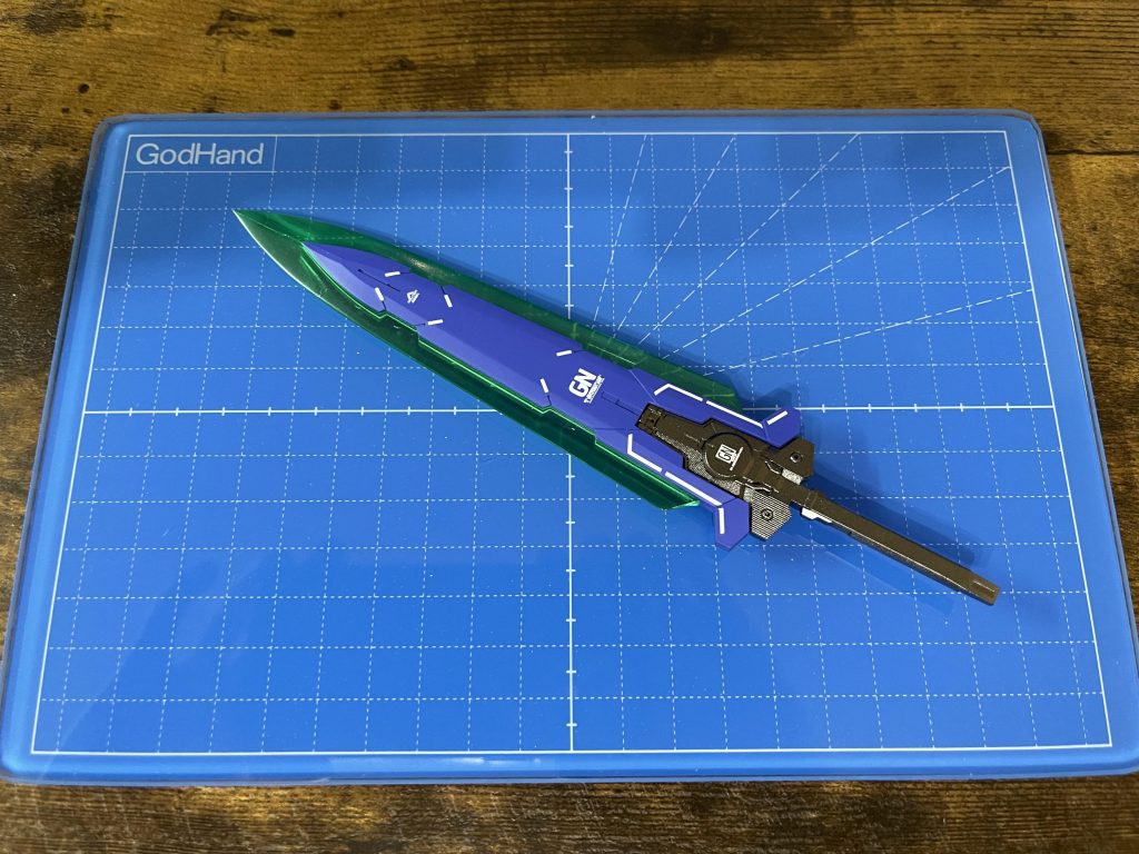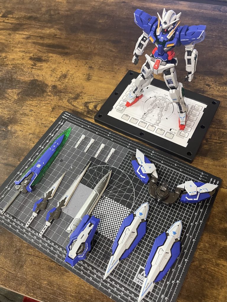 MGエクシアに3Dプリンターで製作したプロトGNラスターソードとデヴァイズバックパックを装着しました。