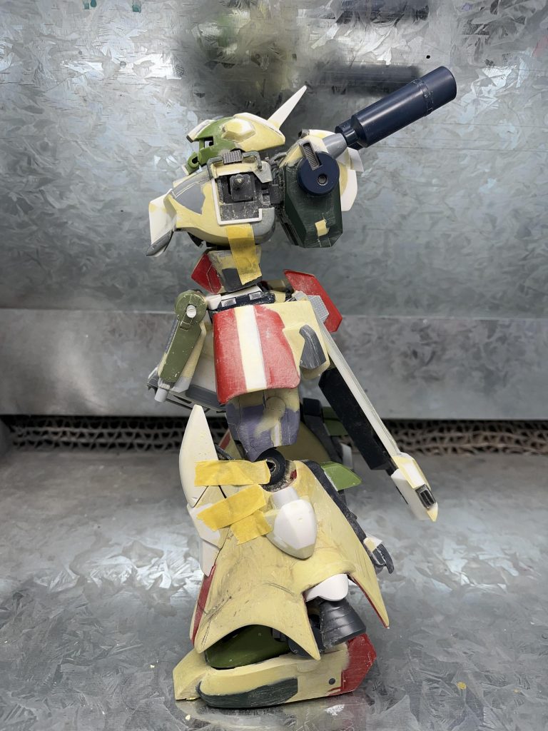 設定途中。緑がMGハイザック、赤がMGサザビー、紫がMGドム、グレーが旧キットザクⅢ。白部分はパトレイバーのイングラム、肌色はエポパテです。