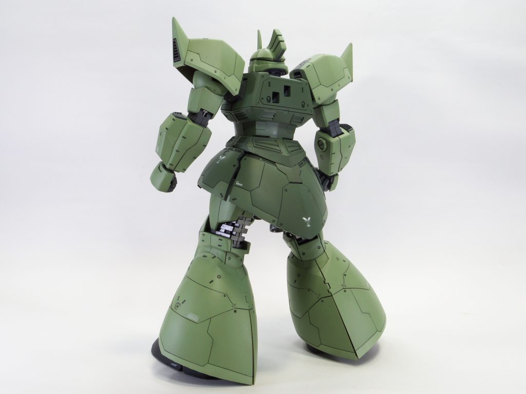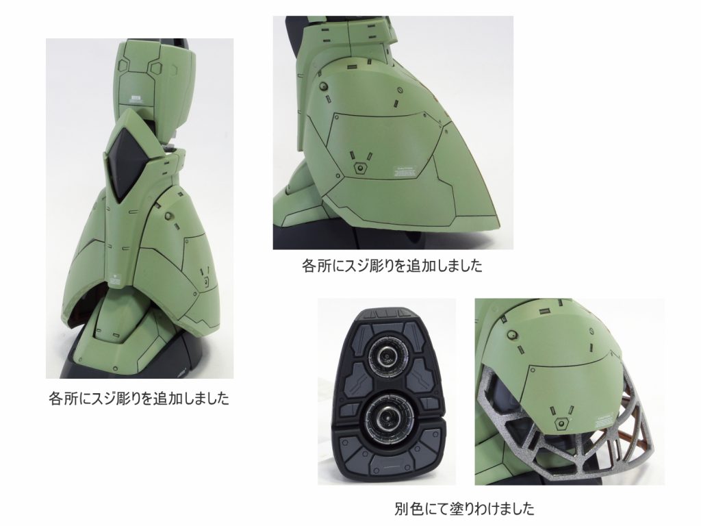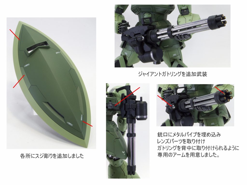 スジ彫りの追加を褒めて頂き嬉しいです。ゲルググにはゴツい武器が似合と思い制作しました。