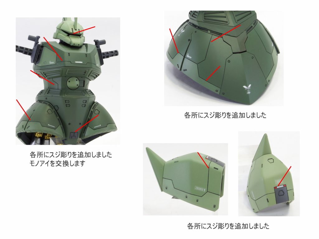 本体の各所のプロポーションを変更しました。 全体的にスジ彫り…