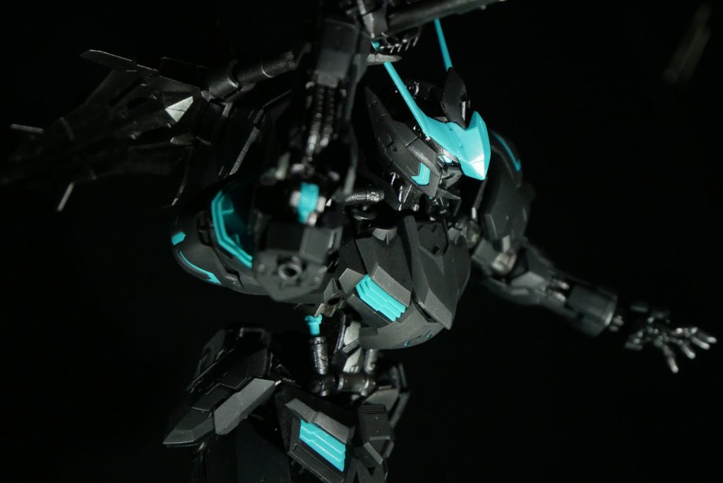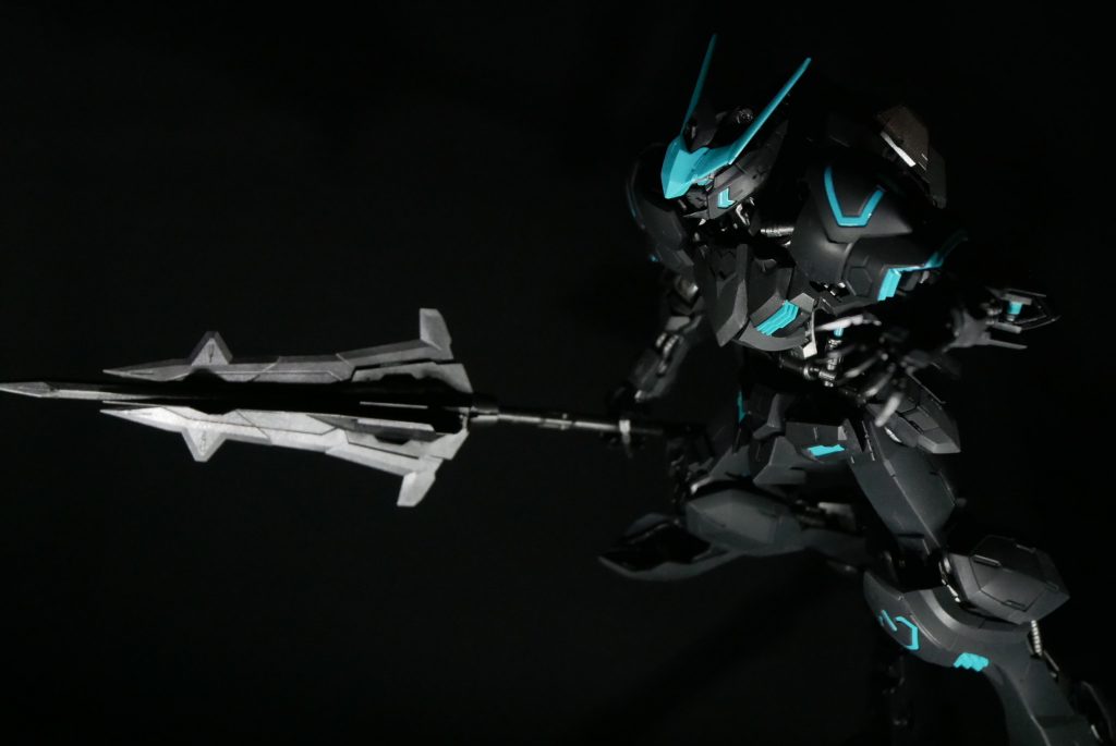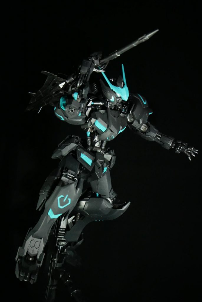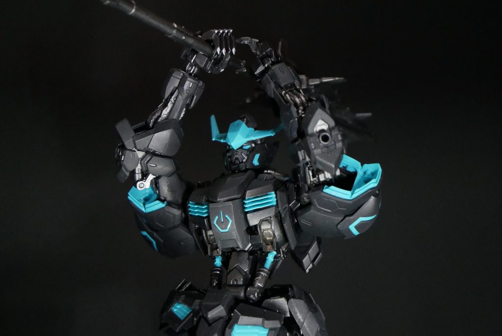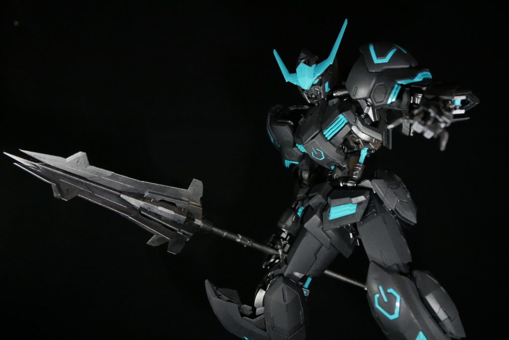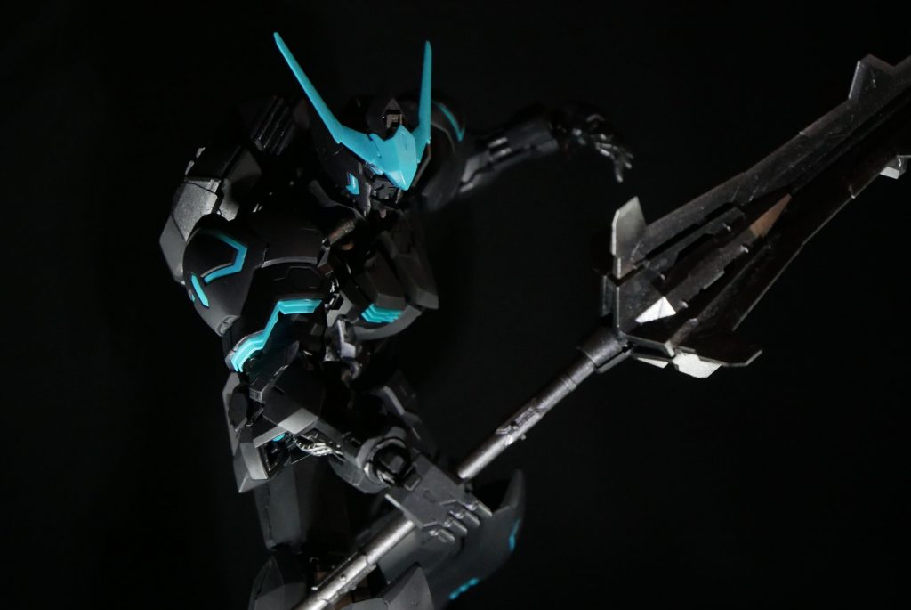 MG ガンダムバルバトス リサーキュレーションカラーです。勝手に一目惚れしたキットですが、黒とネオンブルーのコントラストで悪人づらが強調され、しかもお値段も本家以上というどんでもないキットです。無塗装だと、全身真っ黒で内部フレームと装甲との違いが見分けがつかないので、ガンダムフレーム(内部)をガンメタ・ウェザリング塗装しました。装甲は、エコプラ自体がとてもよい色の黒だったので、クリアーつや消しのみで、マットに仕上げてみました。