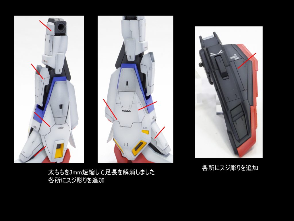 太ももをプラ板にて1mm幅増ししました。 各所にスジ彫りの追…