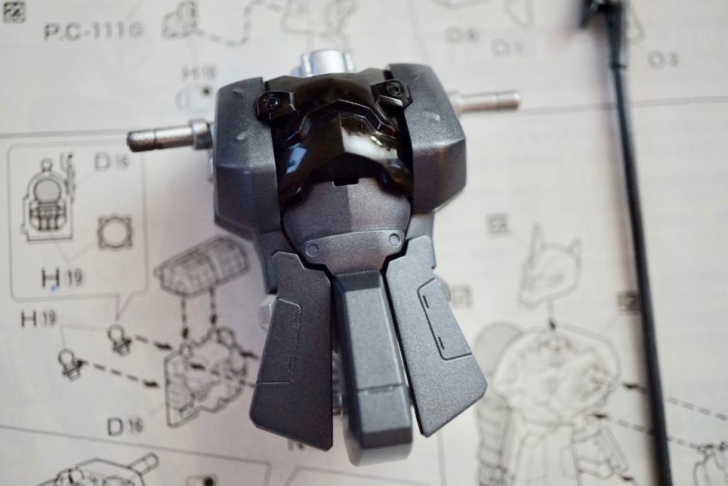 胸部と腰部の外装を組んだ状態。ボディー外装の青い部分はライトメタリックブルー。胸部と足の黒い部分はガンメタリック+スモーク。そして胸部&腰部には最近お気入りのカラーのタミヤTS-100 ブライトガンメタル・セミグロスで塗装。この部分だけセミグロスにしたのが良いアクセントに。
