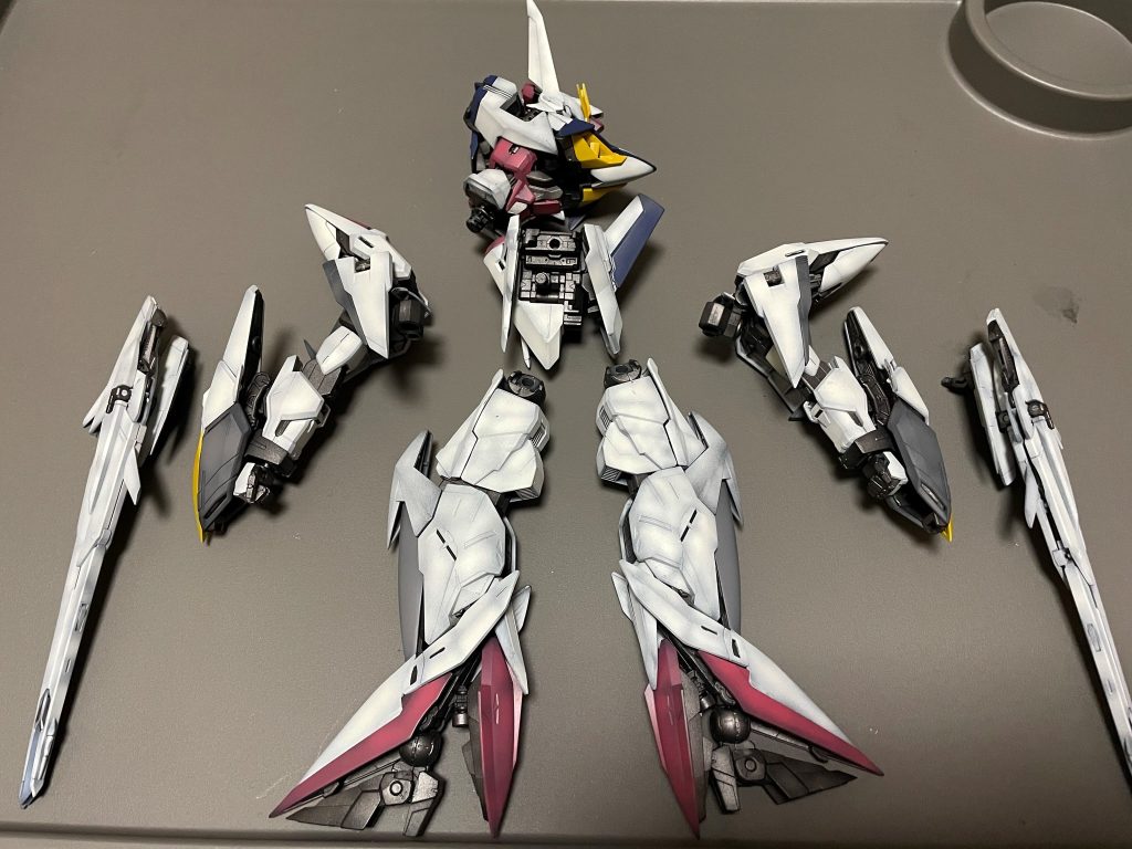 MG 1/100 MVF-X08[ECLIPSE GUNDAM(エクリプス ガンダム)] を制作しました。SEEDシリーズやこの機体が活躍する外伝等を観たことがなく、物語の世界観や所属する軍等を含めたバックボーンを全く知らない中、箱絵のデザインに一目ぼれして購入。機体の機構もユニークで、特に脚部は独特な作りとなっているため、楽しみながら組むことができました。塗装はグラデーション塗装(黒立ち上げ)としましたが、何か所か塗り直し。塗装計画の大切さを実感させられました、、、。また、配色を、機体の設定色とは少し異なる色(多少赤・白多め)にしました。完成時に違和感のない配色になるように心がけたつもりです。