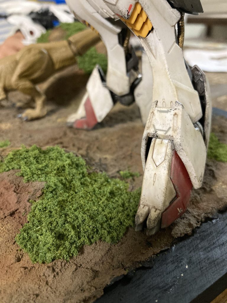 ジオラマはガンプラ凄技本を参考にしました。砂漠以外のジオラマ作成は初めてでしたが、子供のおかげで楽しく作れました。アニアの恐竜とバルバトスを並べて撮ってみたのでしたが、スゲー!と息子と一緒に興奮してましたw