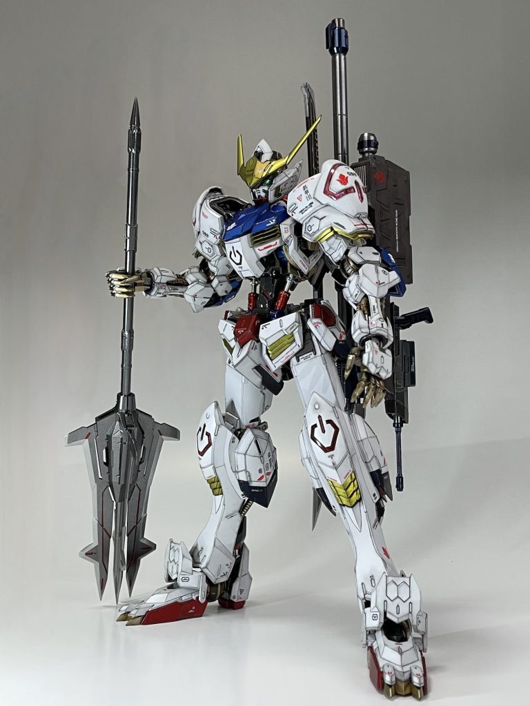 MG 1/100 ASW-G-08 バルバトス 完成 素組み、塗り分け塗装と、凸凹エッジALL墨入れ仕上げです。 メカ感&稼働感を狙ってます。 ホワイト外装裏面は、光透過考慮し黒銀を筆塗り。