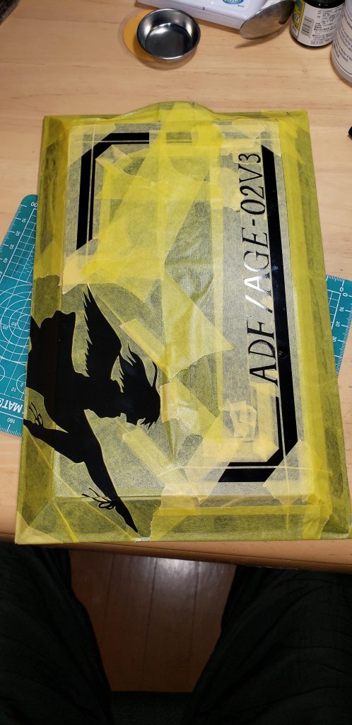 せっかくだからメタルROBOT魂みたいな台座が良かったので光沢ブラックで塗装後に機体名と、いい感じのライン、天使と戦女神を混ぜたようなオリジナルのキャラクターの形状のマスキングをして塗装しました。