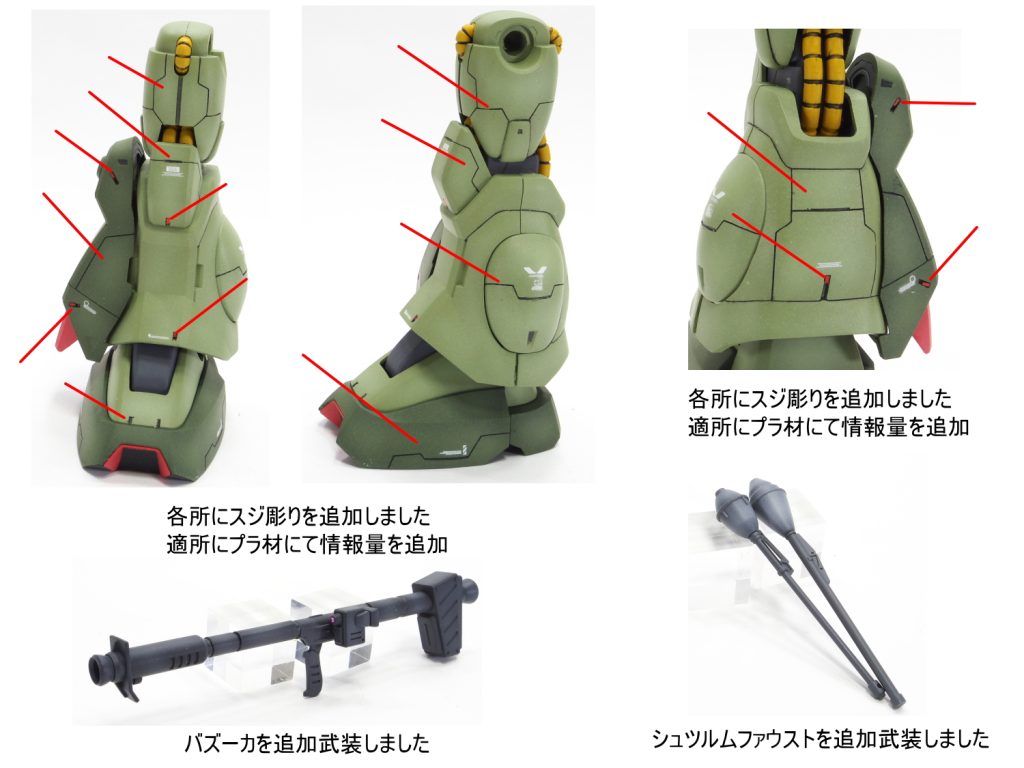 失礼します。完成お疲れ様でした。 毎回、スジ彫りのセンスが素晴らしいです。本当、羨ましい。ザクのはしくれなのだから、バズーカ装備当然 『アリ!!』ですよね。(今まであまり観たことが何故かありません。)