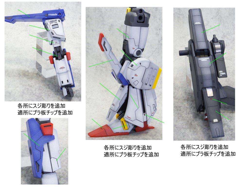 各所にスジボリにて情報量を追加して塗分け 太ももをパテにて幅…