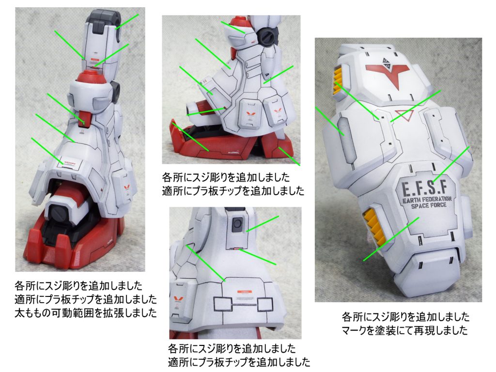 各所にスジボリにて情報量を追加して塗分け 太ももをパテにて幅…