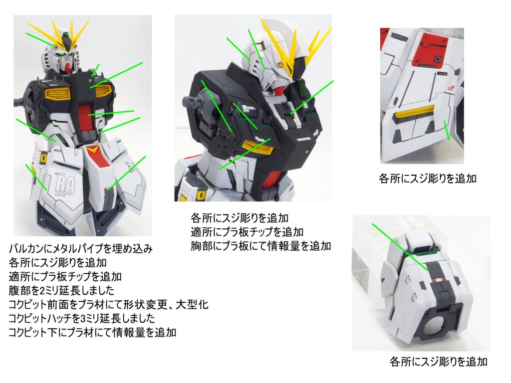 gunplacra… MG 2023.04/28更新 MG νガンダム ver.ka 3256 138 いいねしたモデラー(138) 0 2 作品を共有 腹部を2ミリ延長、コクピットハッチを3ミリ延長 コクピットの前面を2プラ材にて大型化、形状変更しました。 胸部の周りにはプラ材にて情報量を追加。 各所にスジボリの追加や適所にプラ板チップを 追加しました。 MG νガンダム 改造 プロポーション変更 逆襲のシャア 胸部の形状変更をして製作しました。 コメント コメントをして応援しよう コメントにはログインが必要です gunplacraft 主に連邦系のMSが好きで製作しています たまにジオン系のMSも気が向いたら製作しています 自分の好みに改造したりしています。 9 RG ガンダム ダブルオーライザー 適所にスジ彫りの追加とプラ板チップを埋め込みました。 グラデ… 9 HGUC ジオ 全体的にスジ彫りを追加して情報量を増やしました。 股間部をプ… 9 HGUC ゲルググ 本体の各所のプロポーションを変更しました。 全体的にスジ彫り… 9 HGUC グフカスタム 太ももをプラ板にて1mm幅増ししました。 各所にスジ彫りの追… gunplacra…さんのページ この作品をお薦め作品に設定する Please login to update your profile! Please login to update your profile! Please login to update your profile! Please login to update your profile!