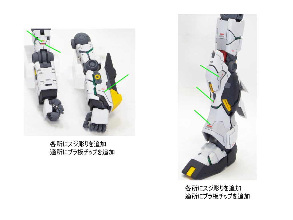 太ももをプラ板にて1mm幅増ししました。 各所にスジ彫りの追…