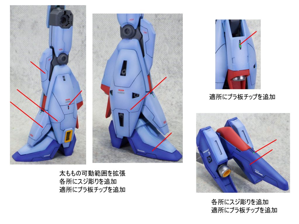 各所にスジボリにて情報量を追加して塗分け 太ももをパテにて幅…