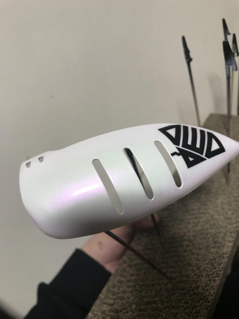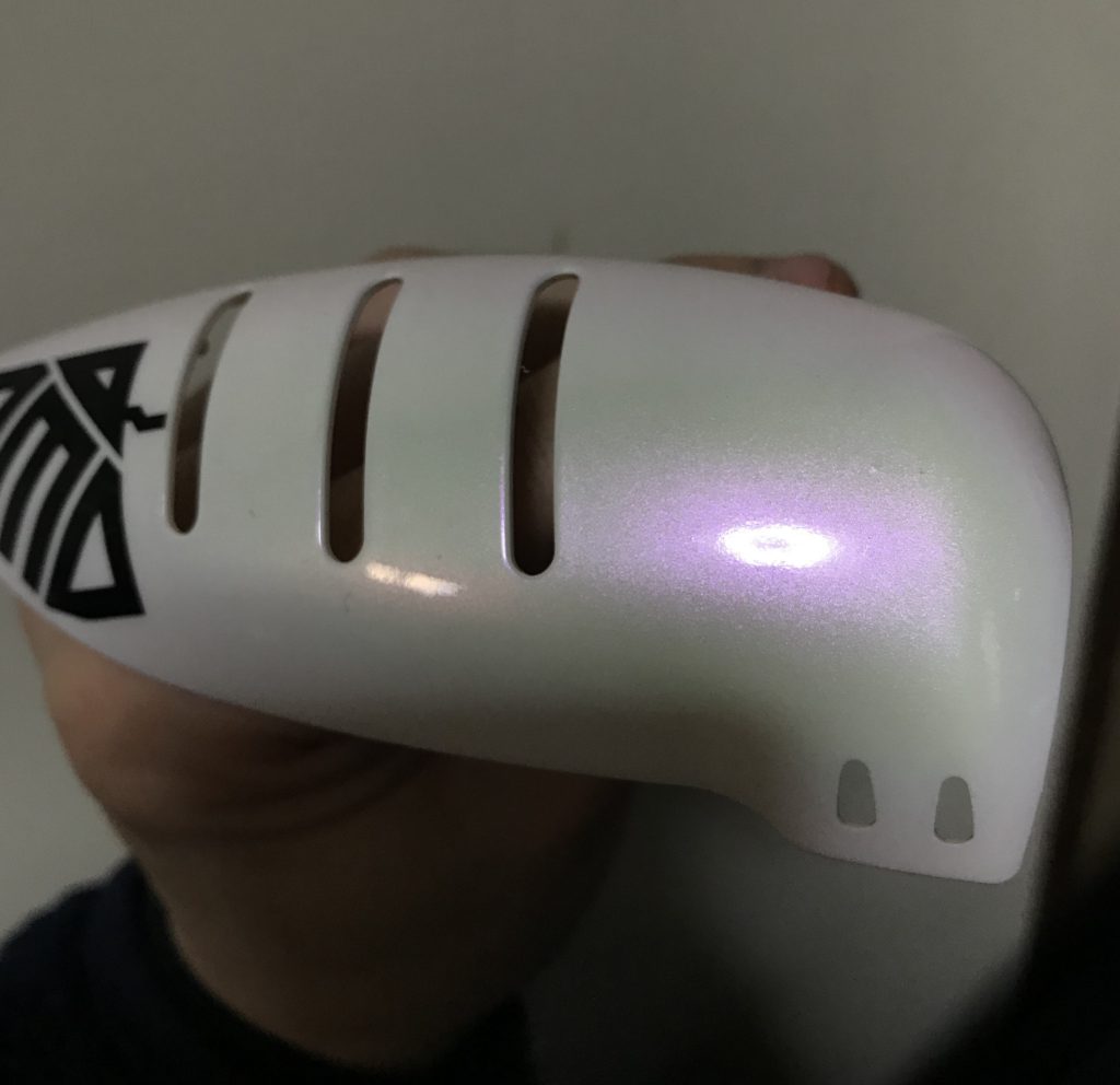 中々画像では伝わりにくいですが、光の加減でホワイトの中にパープルが妖しく光る仕上がりにしています。