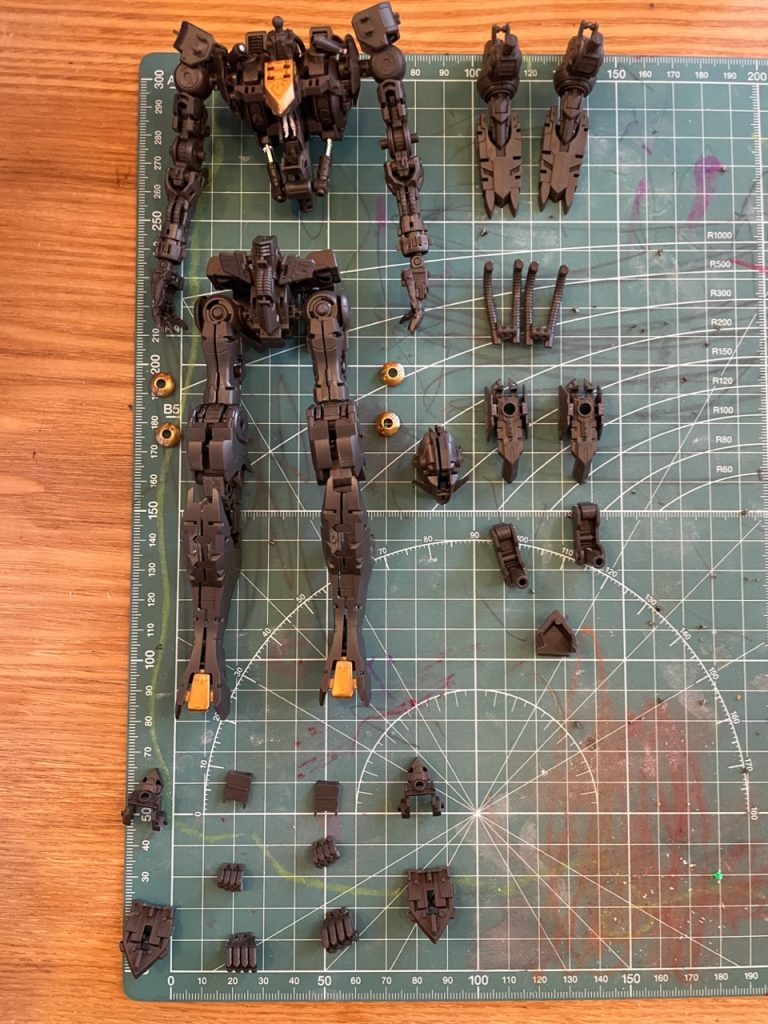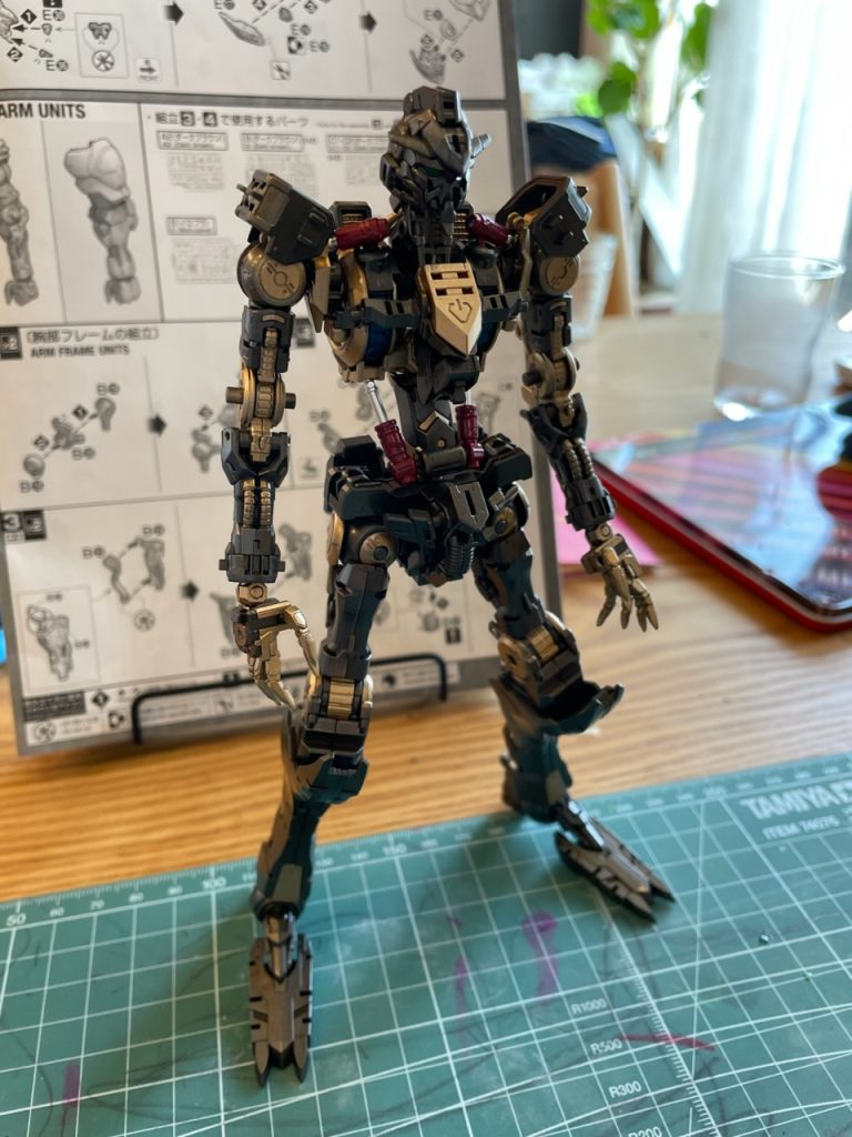 フレームを組み上げた時点でカッコ良かったので、一部フレーム剥き出しで完成としました(結果的に右腕、右腿、胸の一部を剥き出し)。