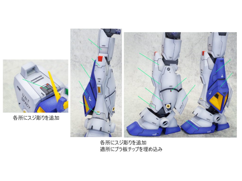 各所にスジボリにて情報量を追加して塗分け 太ももをパテにて幅…