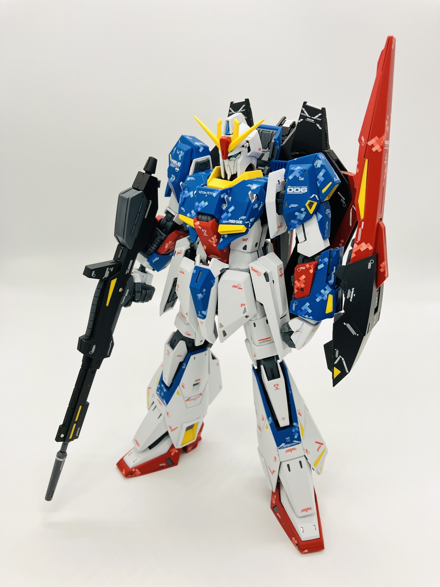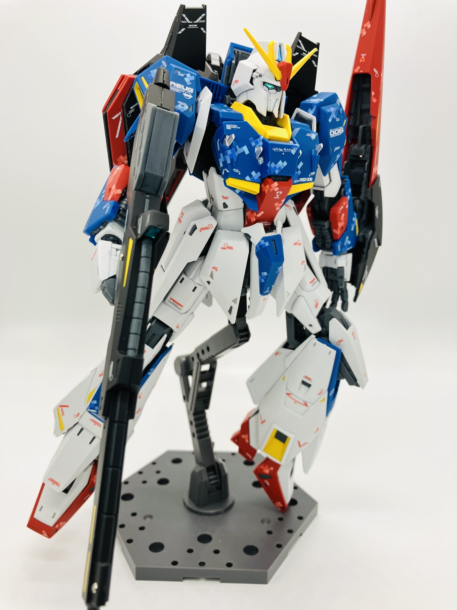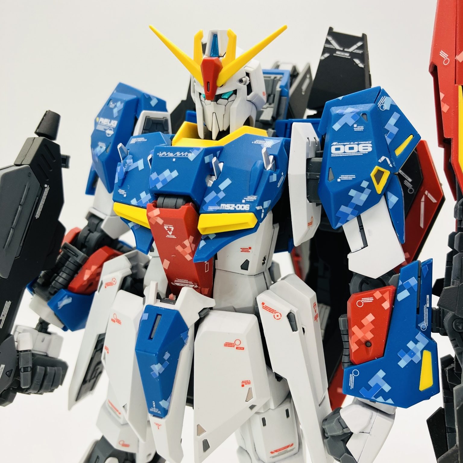 マスターグレードΖガンダム ver.Ka 成形色にピクセル迷彩デカール、スミ入れから再びデカール、仕上げにトップコートからメタルパーツの簡単フィニッシュちょいプラスです。