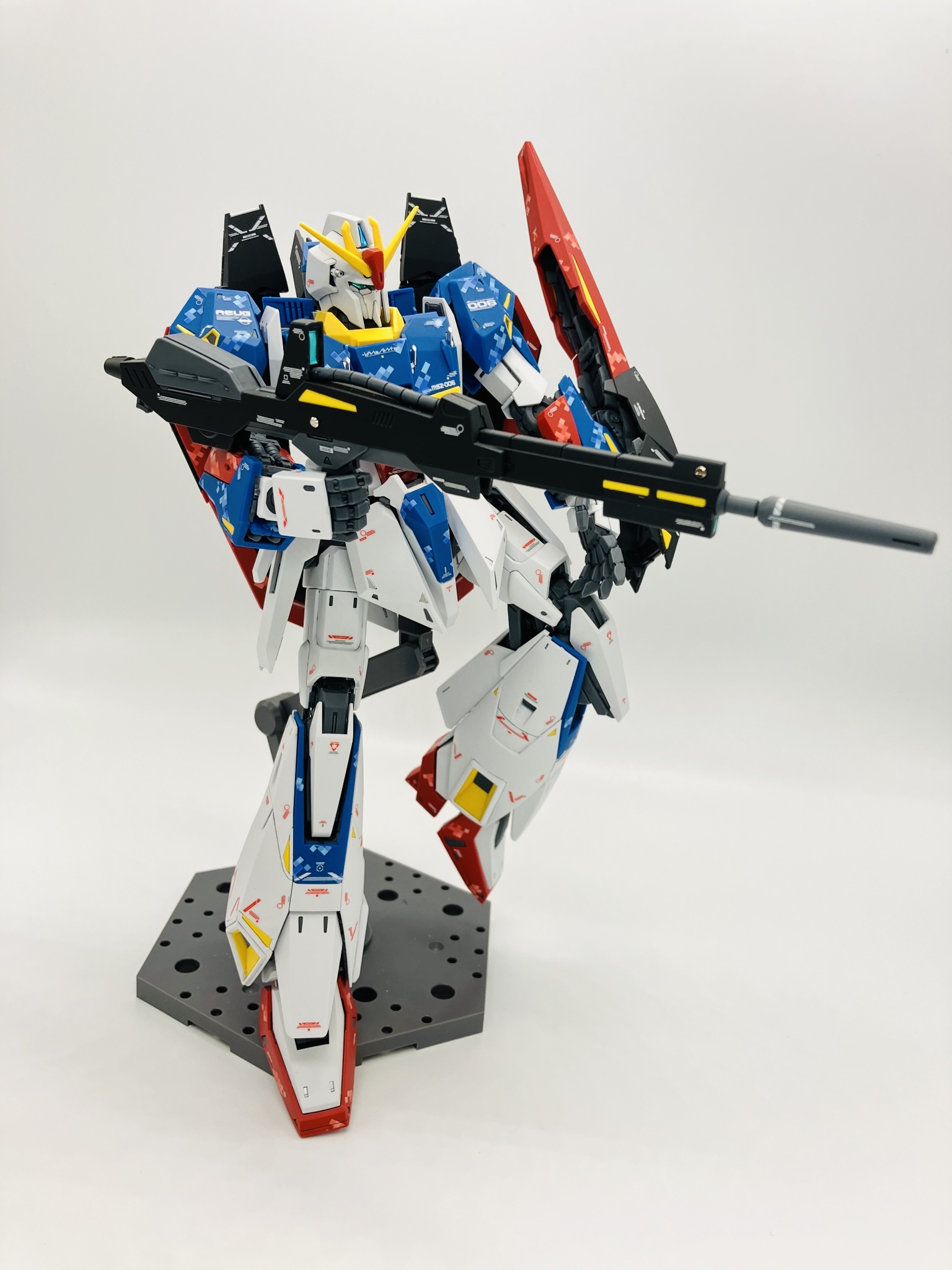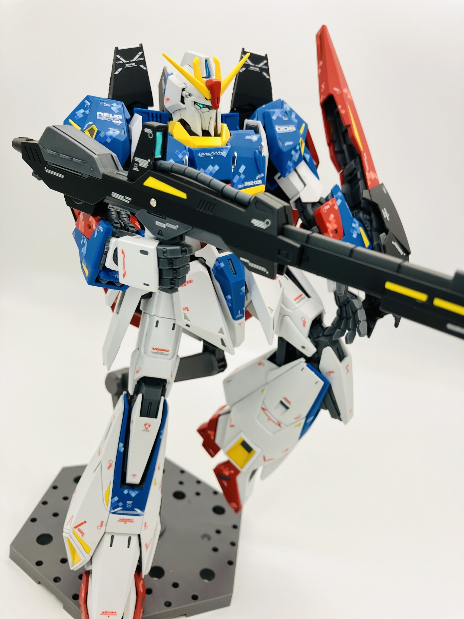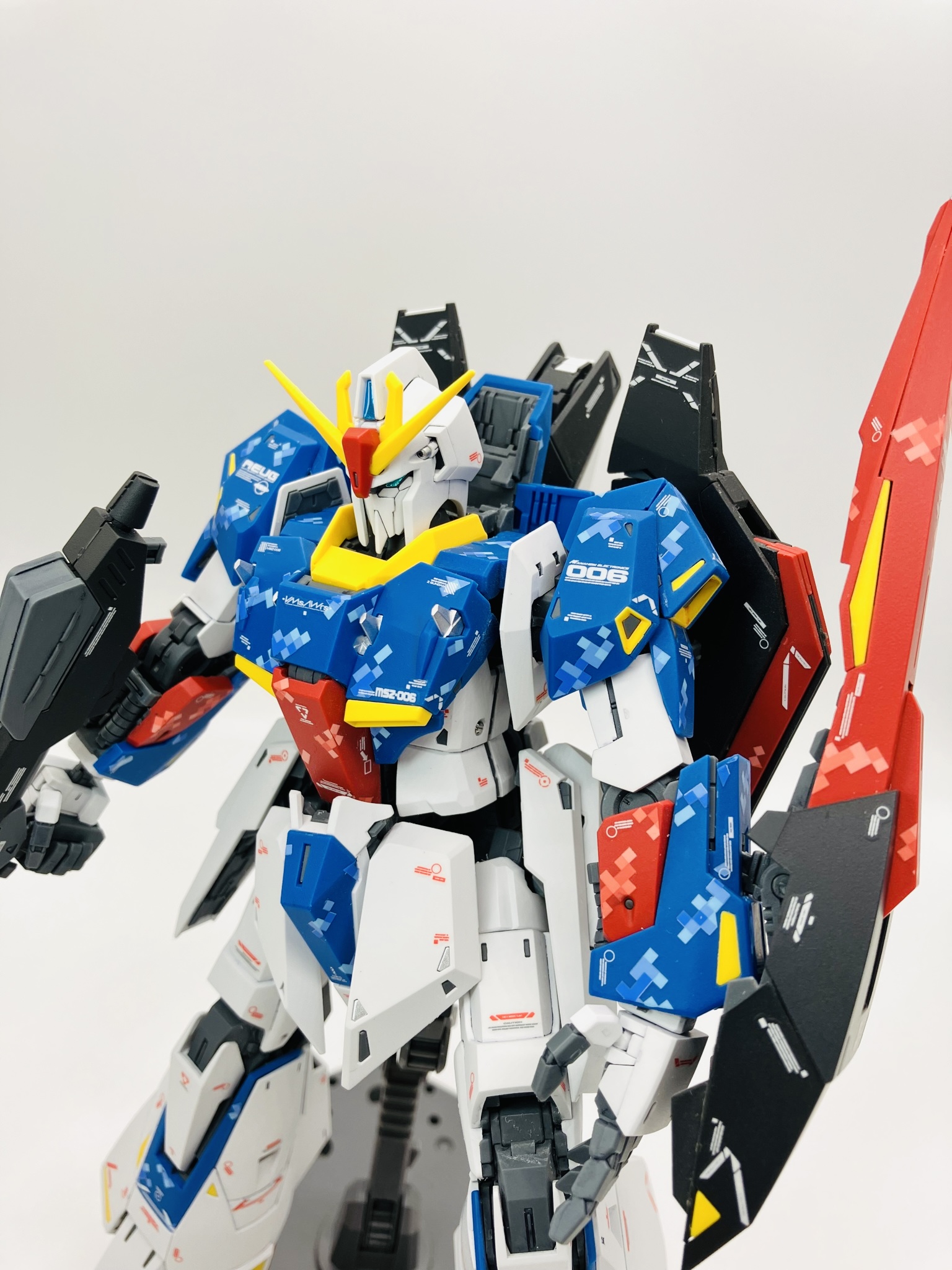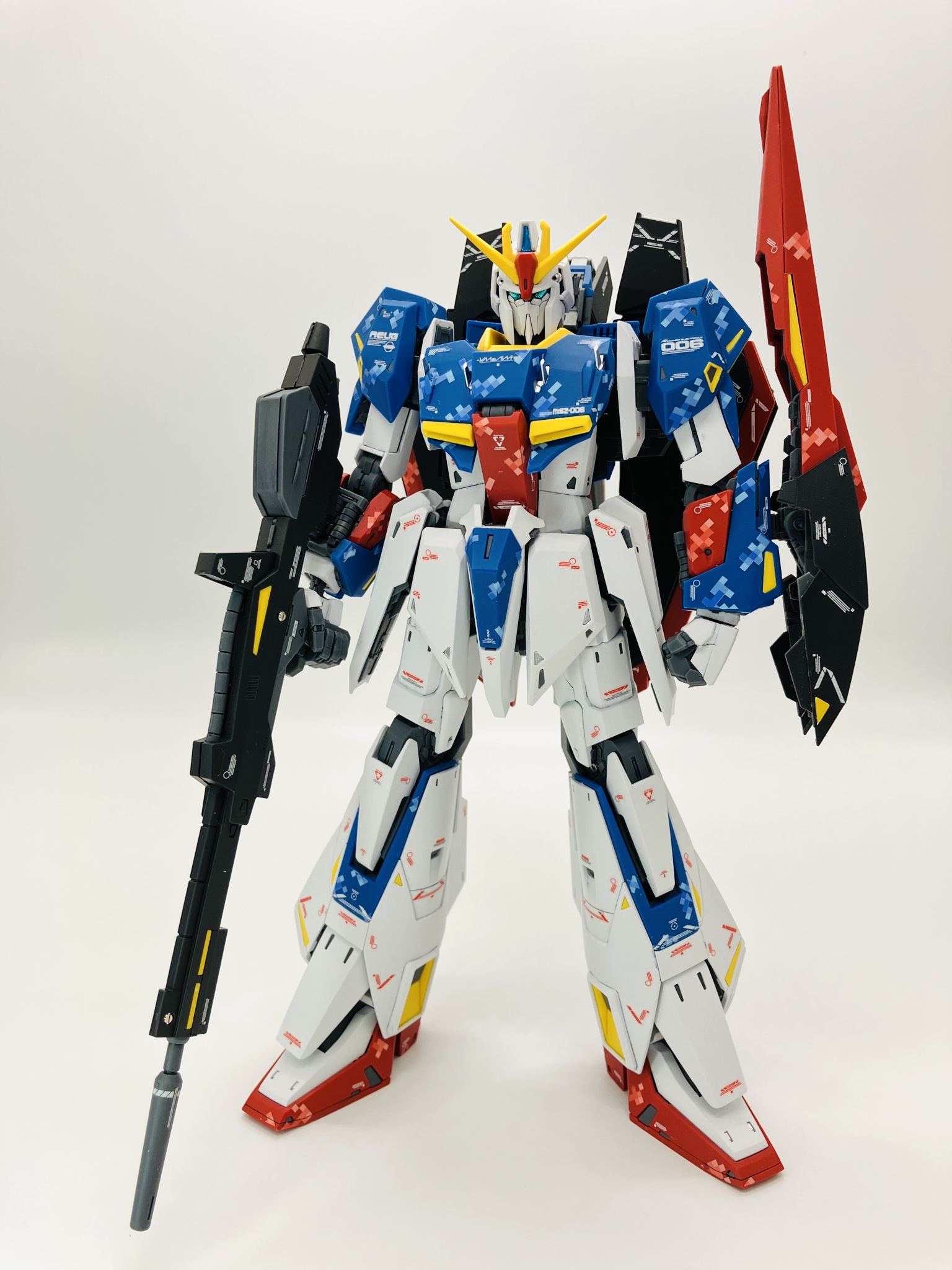 マスターグレードΖガンダム ver.Ka 成形色にピクセル迷彩デカール、スミ入れから再びデカール、仕上げにトップコートからメタルパーツの簡単フィニッシュちょいプラスです。