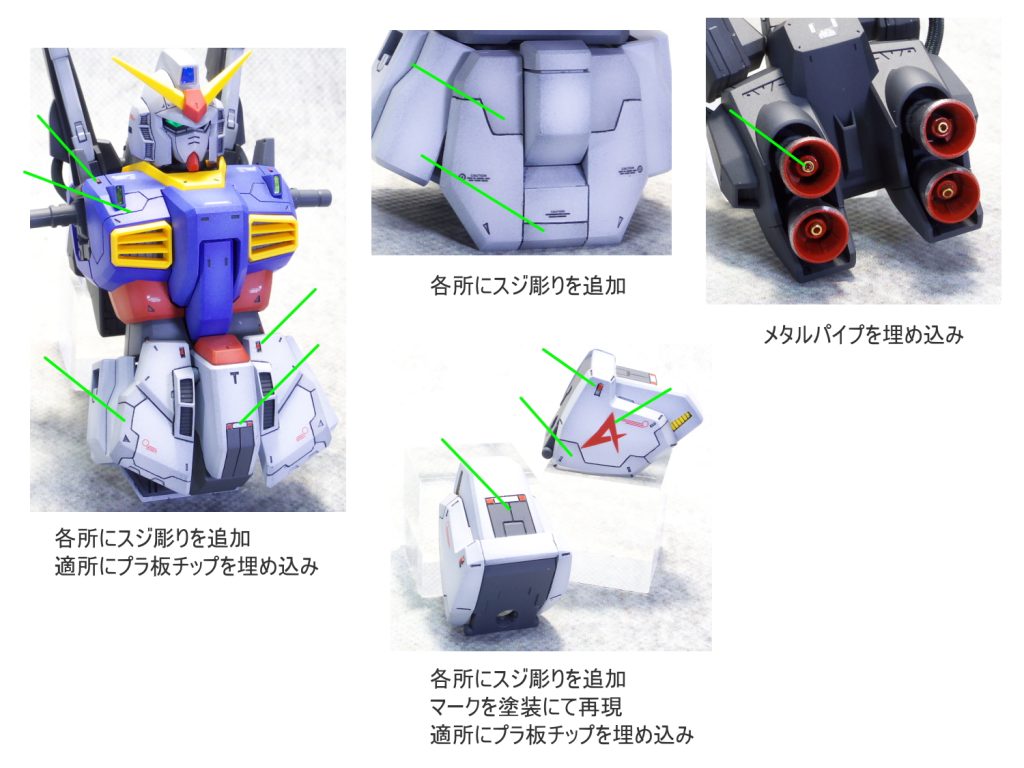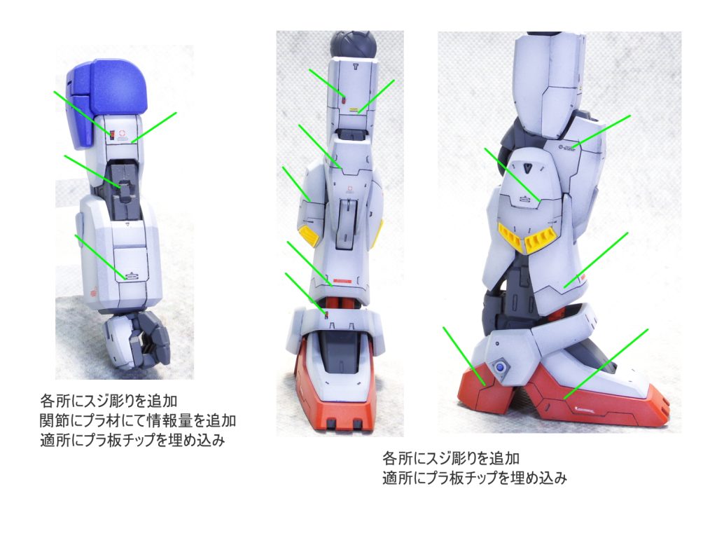 太ももをプラ板にて1mm幅増ししました。 各所にスジ彫りの追…