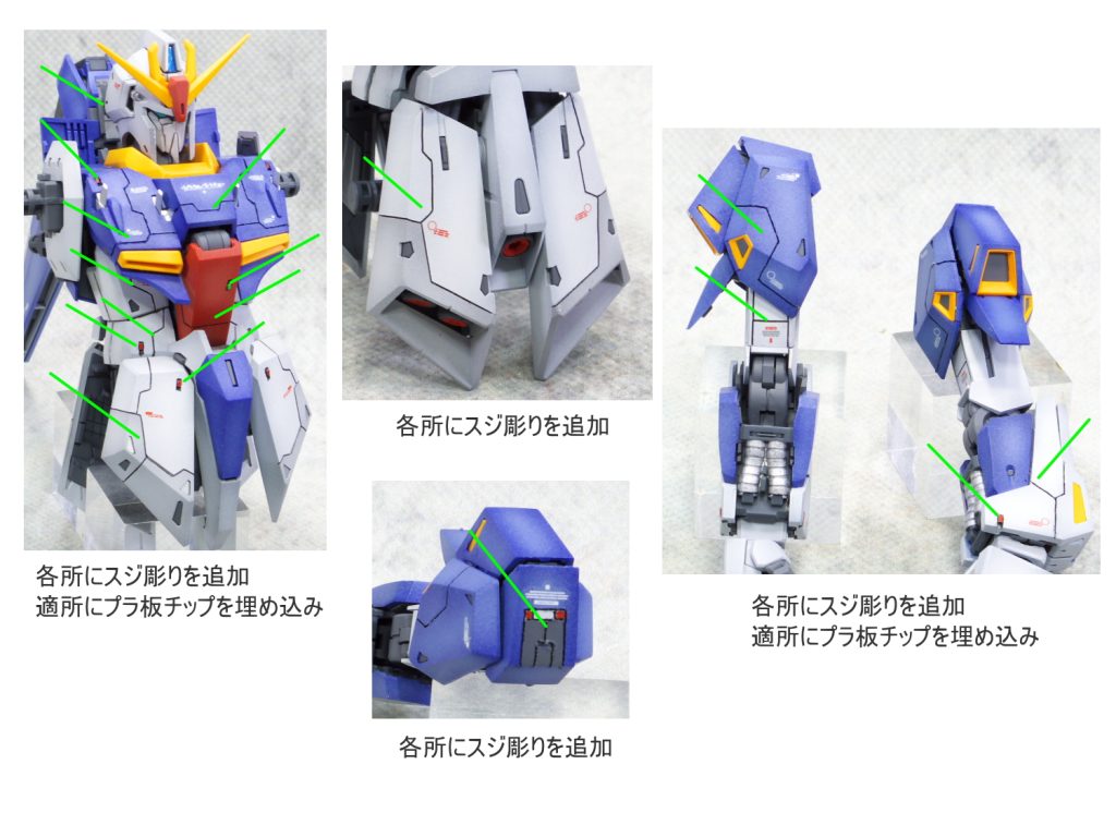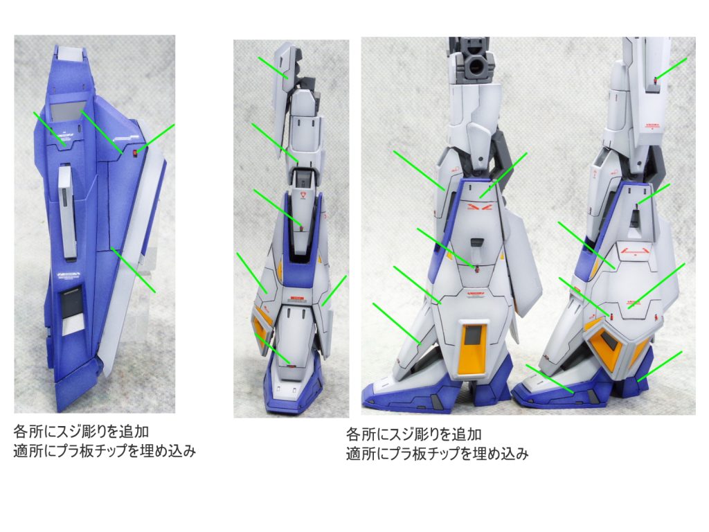 太ももをプラ板にて1mm幅増ししました。 各所にスジ彫りの追…
