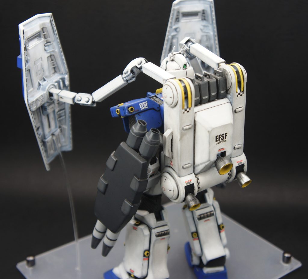 ジャンクであったMGガンダムと陸戦ガンダムをベースに作成いたしました。脚部は特徴的な形状をしているため外装パーツはフルスクラッチです。