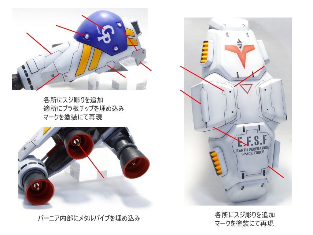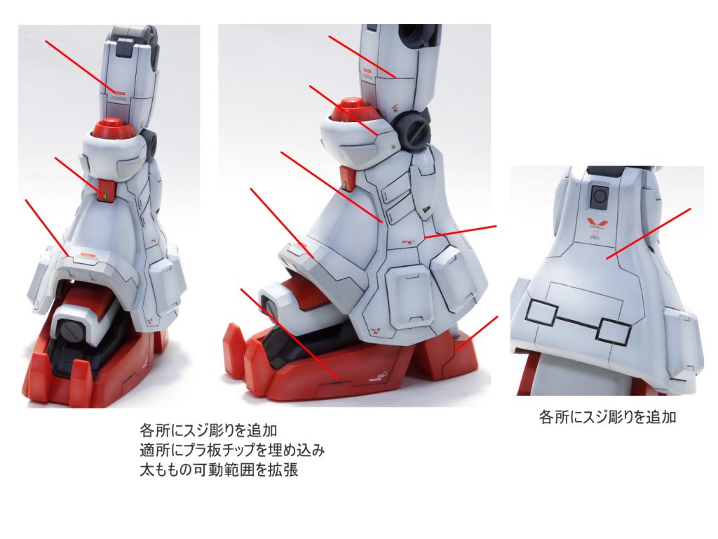 太ももをプラ板にて1mm幅増ししました。 各所にスジ彫りの追…
