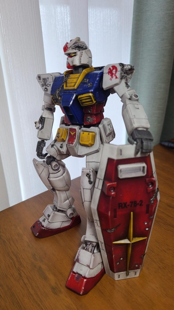ほったらかしていた大昔のキットを掘り返し、どうなってもいいやと古さに合わせて汚し、適当に痛め付けてみました。撃たれ、斬られ、を想像しながら初めてダメージ加工をやってみたら楽しく、雰囲気が出て結局かなりの愛着が湧きました。