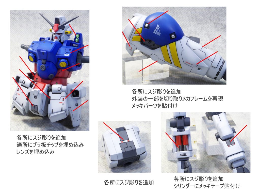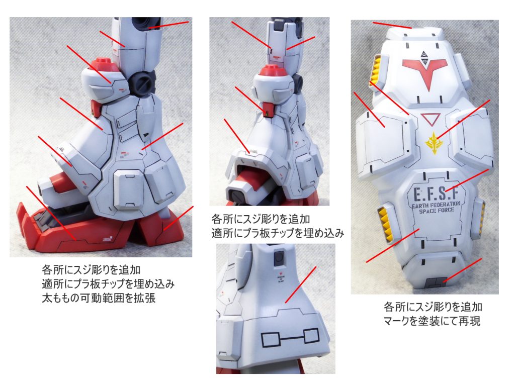 太ももをプラ板にて1mm幅増ししました。 各所にスジ彫りの追…