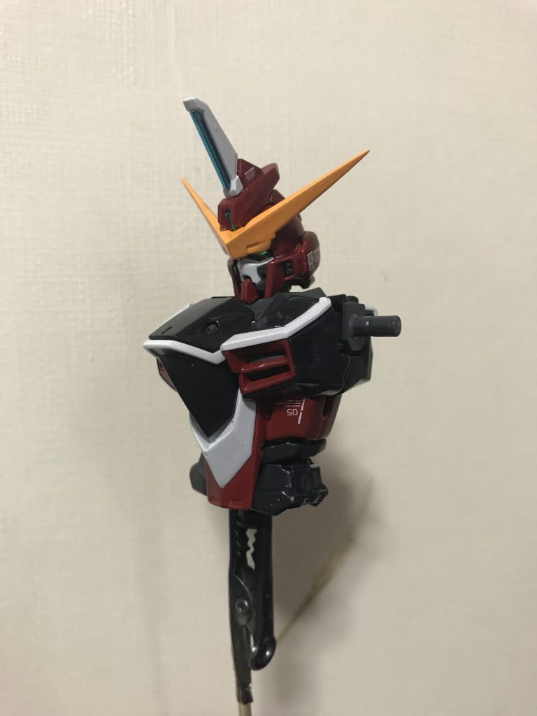 MG ジャスティスガンダムを全体的にダークトーンで、外装の赤やフレームはつや消し、他光沢にて、オリジナルカラーリングで作製しました。