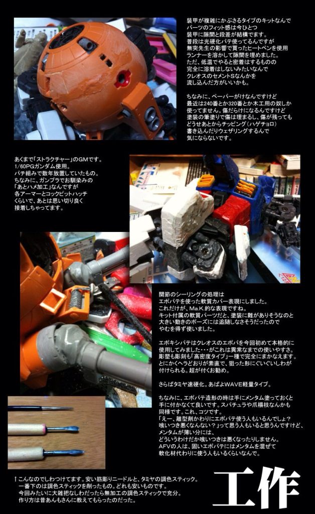 GM(ガンダム)の表面はヒートペンで荒らしています。PGで良かった事は内部構造が再現されているので、ダメージ表現に向いている事です。みんなも派手にぶっ壊して欲しいです。