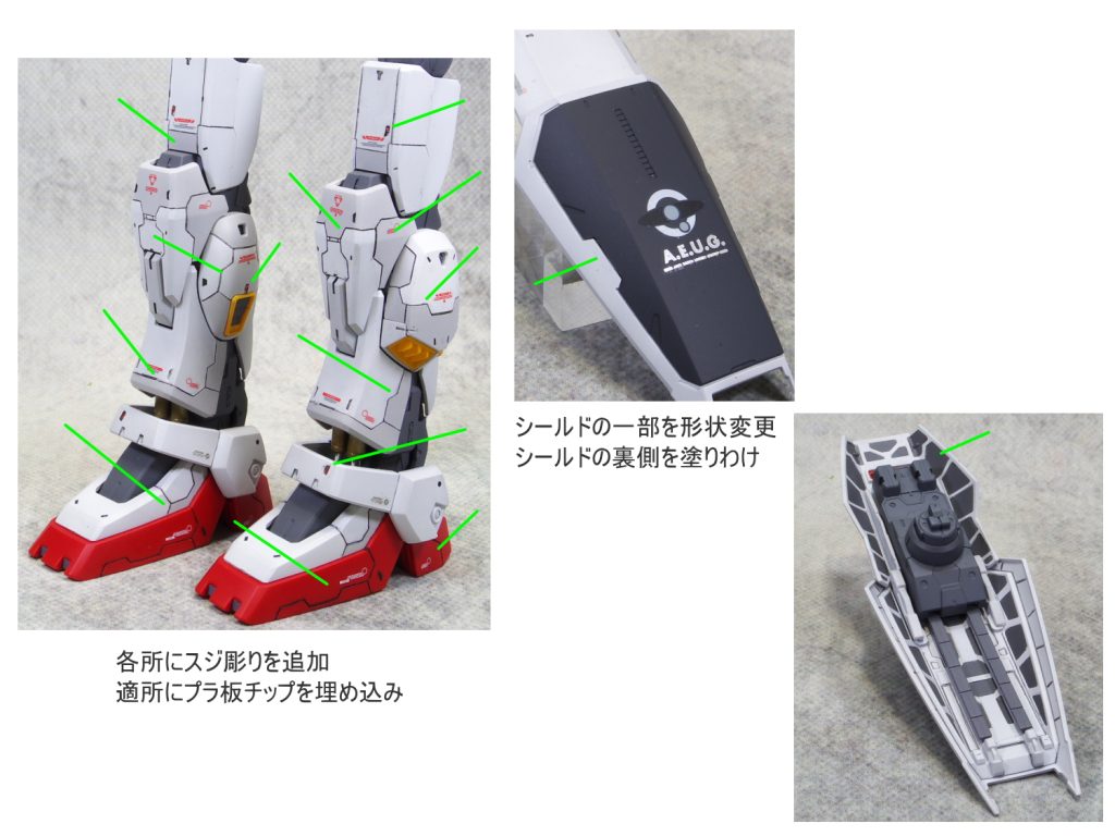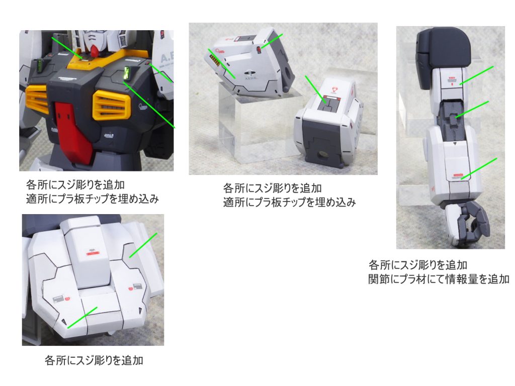 各所にスジボリにて情報量を追加して塗分け 太ももをパテにて幅…