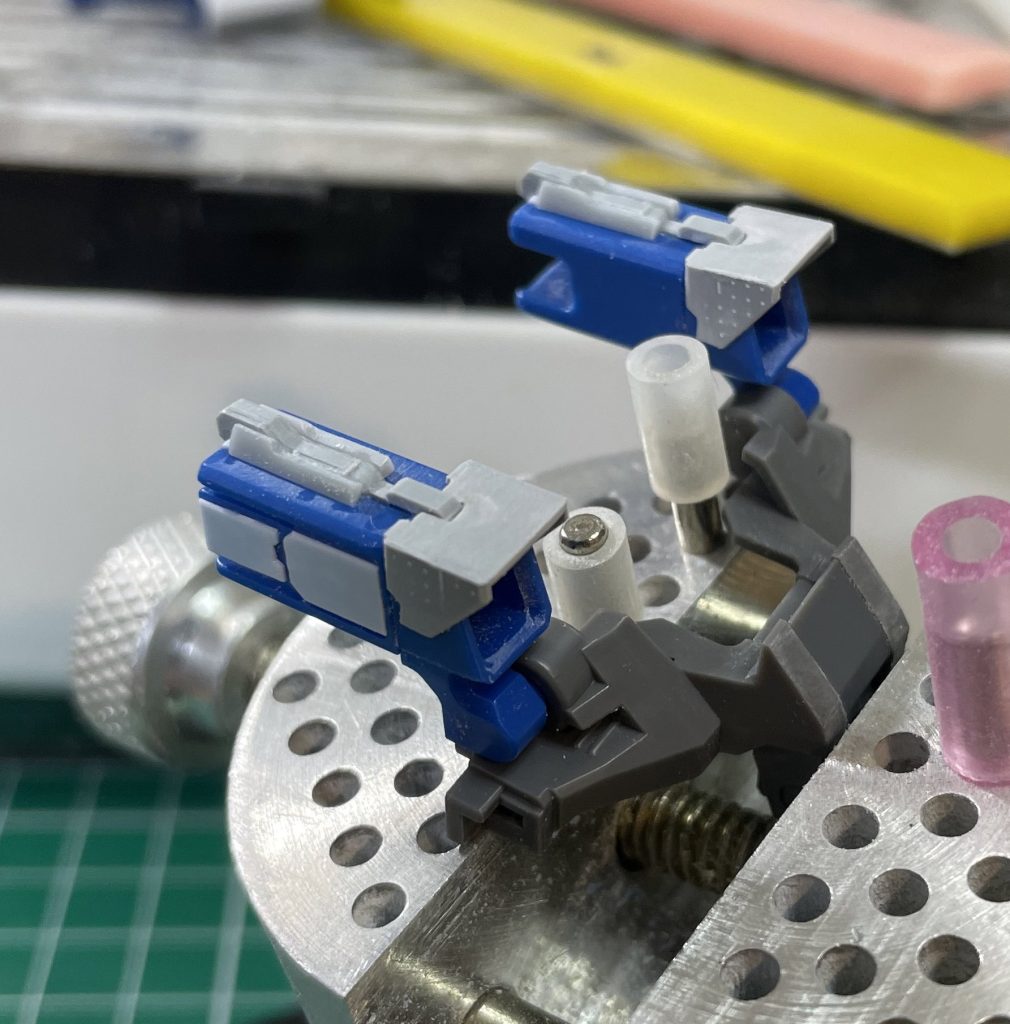 膝カバーは丸みが嫌だったのでパテとプラ板で埋めて上からプラ板を貼り付け