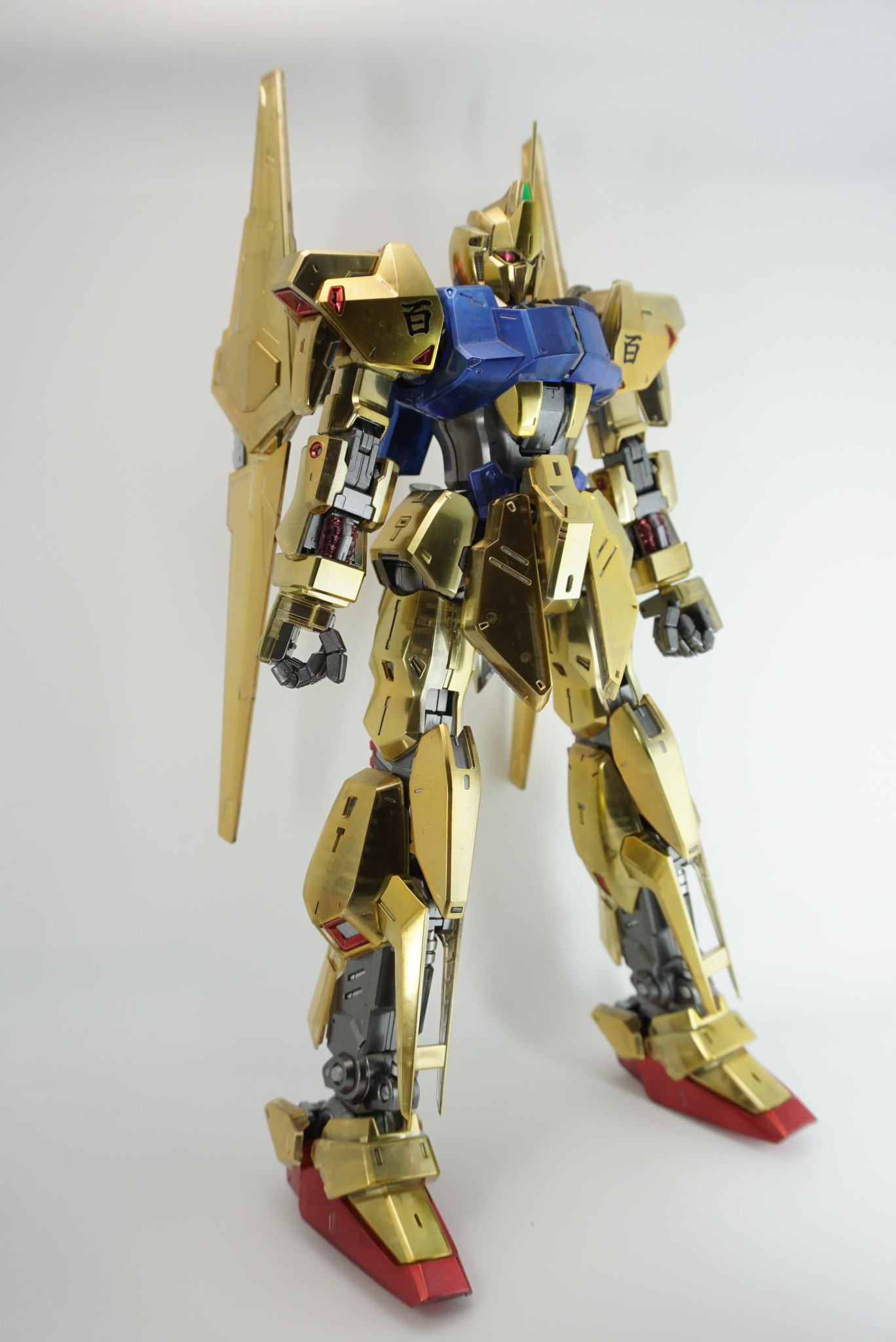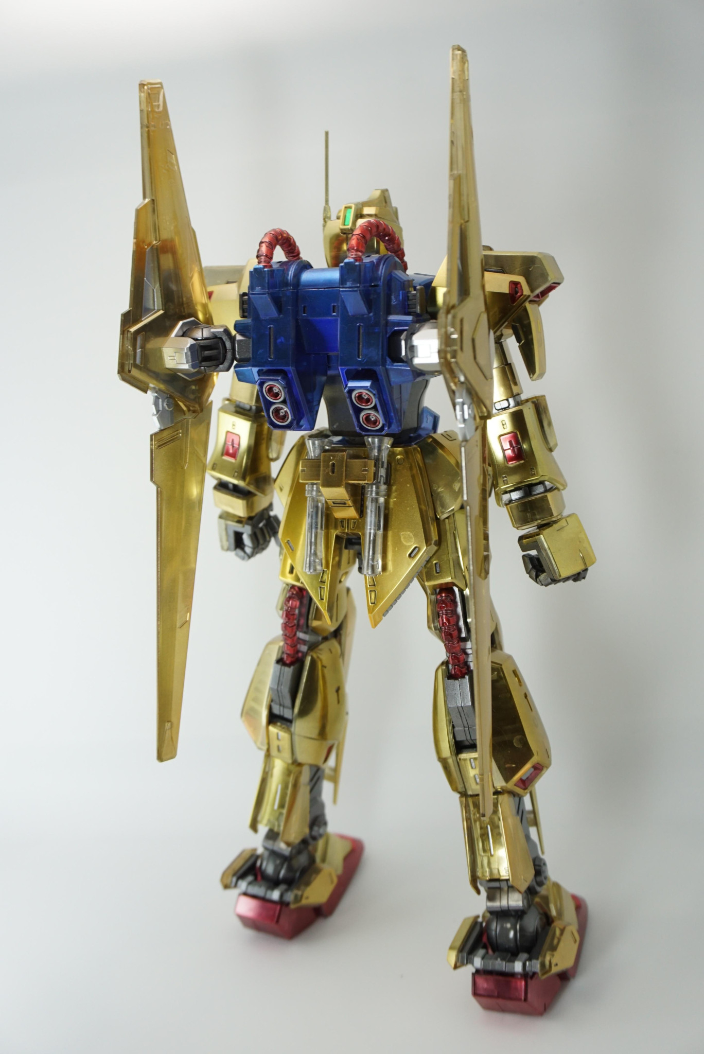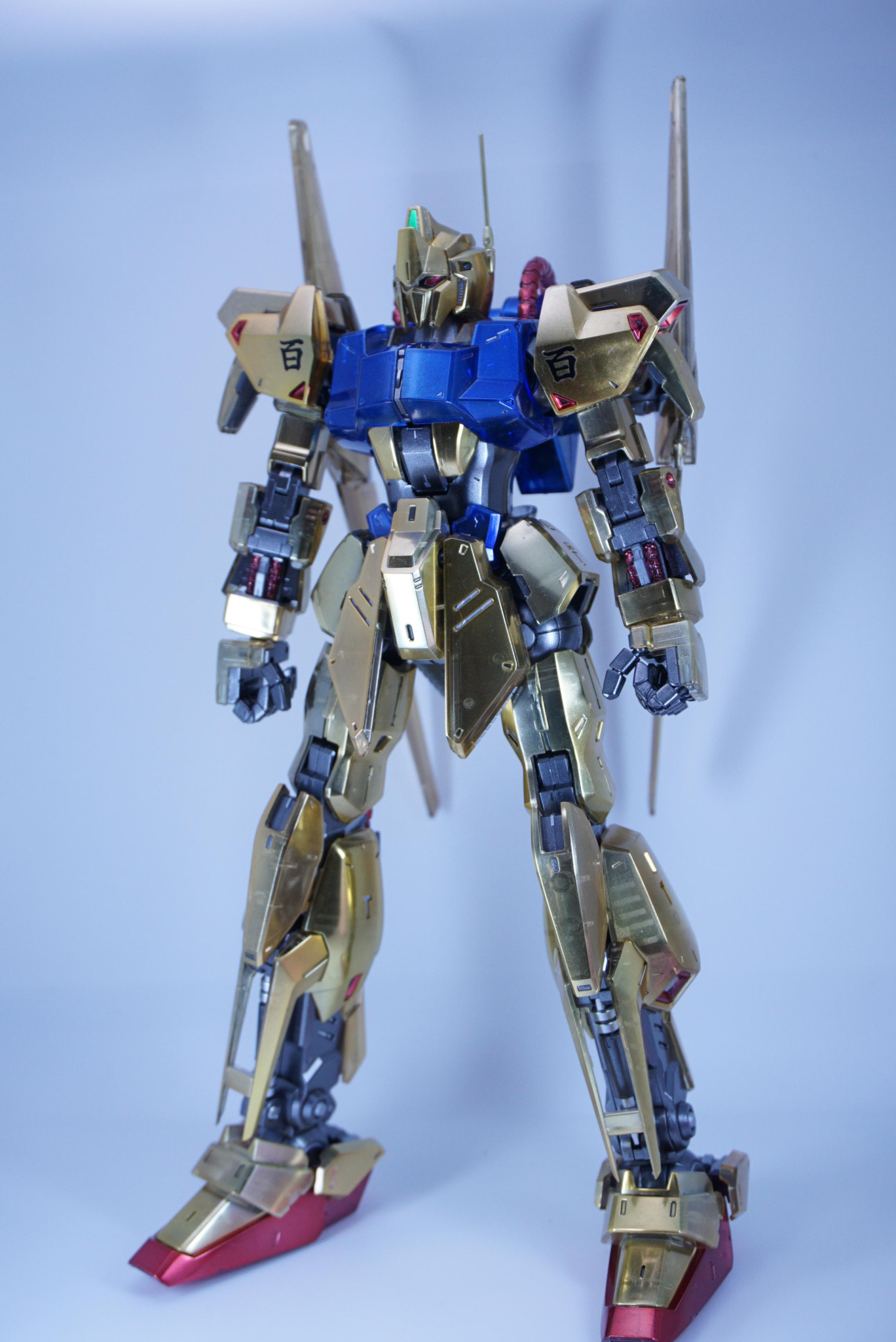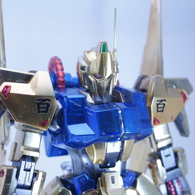 一見 メタリック塗装の通常版に見えますが実はクリア。内部フレームや外装の補強構造がうっすら見える。細かい塗り分けもされていて、じっくり見ても飽きないですね。百式の金とクリアならではの味わい深さを両立させた素晴らしさがあると思います。メタリック塗装の理解が深い事を伺い知れますね。