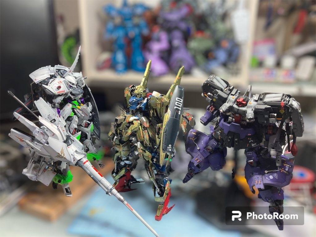 思いのほかハマっちゃってバッキバキの百式になりました締切があったので正直塗装は無茶苦茶でサフ→黒→(迷彩部分白→ピンク→マスキング)→クリア→金(2パターン)→クリアマスキング剥がし→金→クリア→ドライブラシグレー→クリア紫→クリア→クリア→エアブラシで直接車用ワックスゼロウォーターをぶっかける!