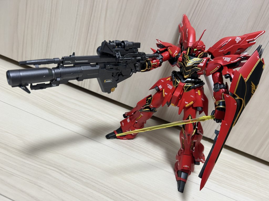 前回のジェスタキャノンが光るのに魅了され、シナンジュも光らせたいと思い頑張って組み込みました。モノアイにはクレオスのLEDを使っています。