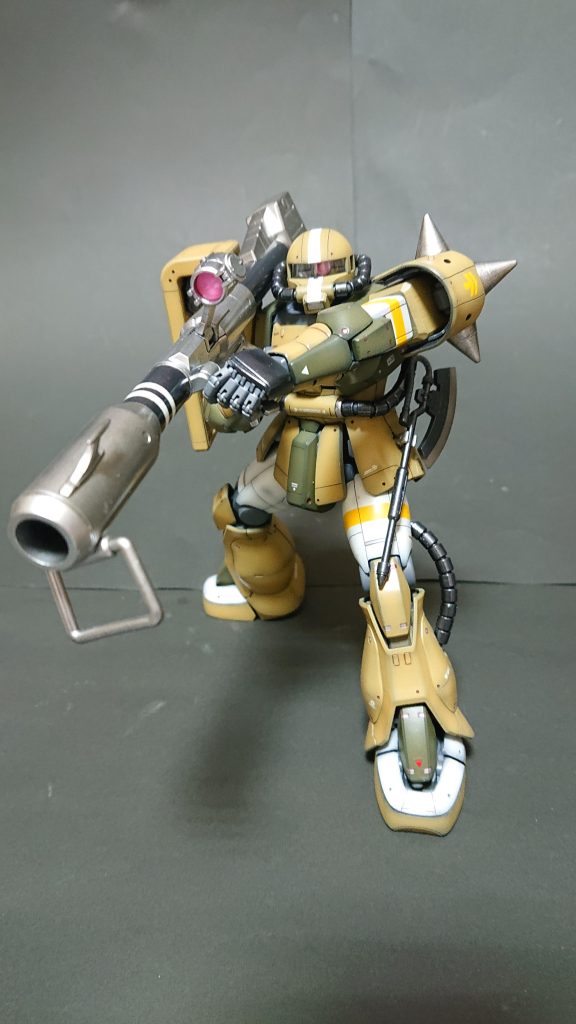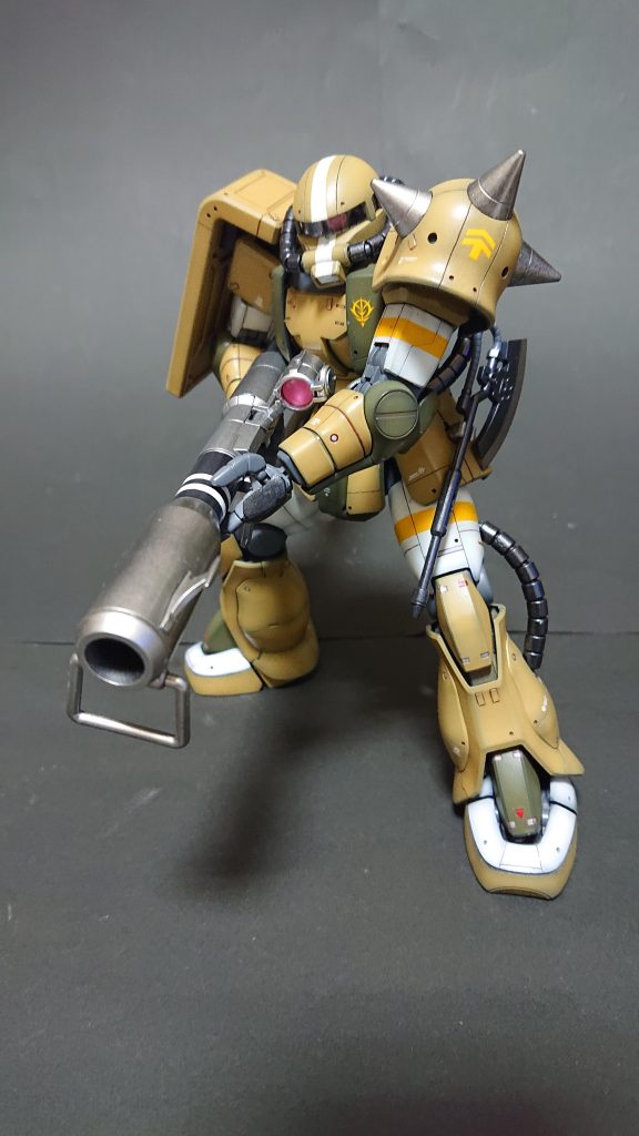 制作の方はディテール🆙のみで、カラーリングは陸戦型なので砂漠をイメージしたMSV風な物に。昔のモデラーにはお馴染みなカラーリングです👍️ドイツ軍戦車の三色迷彩のカラーチャートで塗り分け。頭の白帯は味方の誤爆を防ぐ為の印の帯で、腕、太ももの黄色い帯は部隊識別用の帯です。スケールモデルやってる人なら分かる奴w