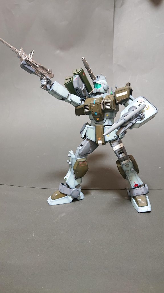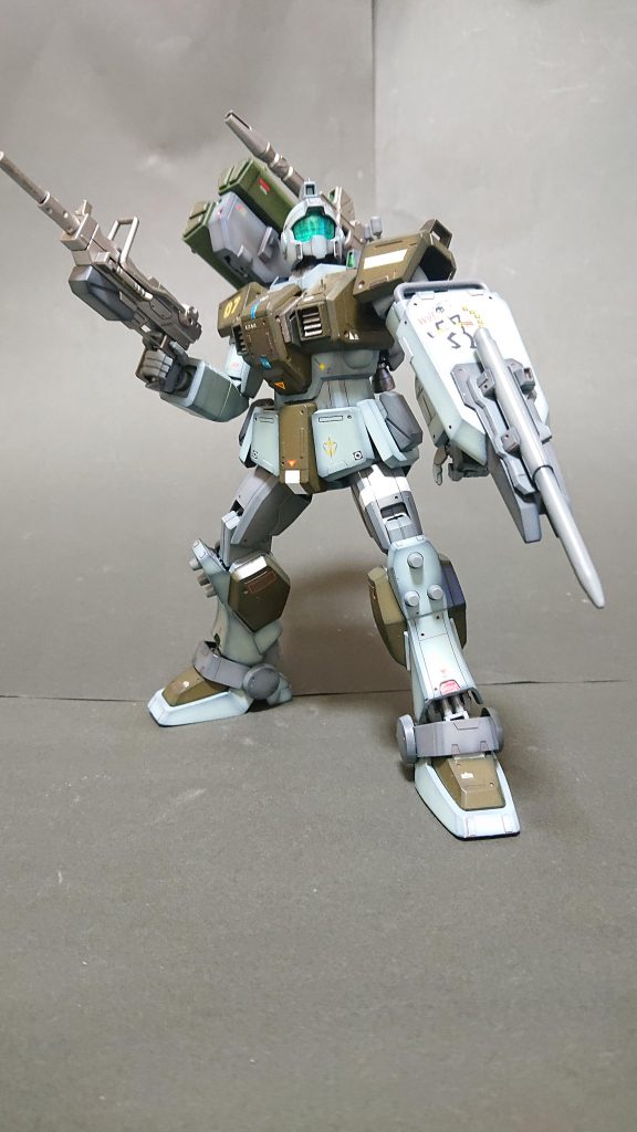 北米で主に市街地戦が任務の部隊に配備されたジムで、索敵も容易には出来ず持久戦が想定された為に多種の武装を携帯出来る用に改修された機体でした。そして、ある程度はホバーの補助も要らないようにアンダーグラウンドソナーをシールドに装備、通信機能を強化した指揮官機です。