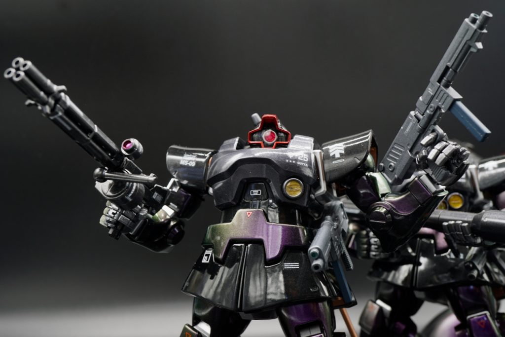 偏光パープル/グリーンをメインカラーとして塗装したドムx3の黒い三連星機。是非ご覧くださいませ♪
