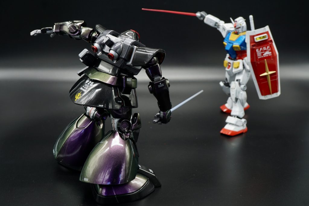子供の頃から一度は作ってみたいと思っていた黒い三連星の三機のドム。配色を考えていた時に頭に浮かんだのが、タミヤのポリカーボネート用偏光塗料パープル/グリーン。光の加減によって紫から緑へと変化する面白い塗料。ツヤ仕上げにするために塗装前の下処理を丁寧にした結果とても良い感じの仕上がりとなりました。