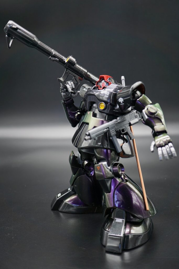 MGの中でも傑作と思っているドムをパープル/グリーンの偏光カラーをメインに全塗装x3で黒い三連星機として製作